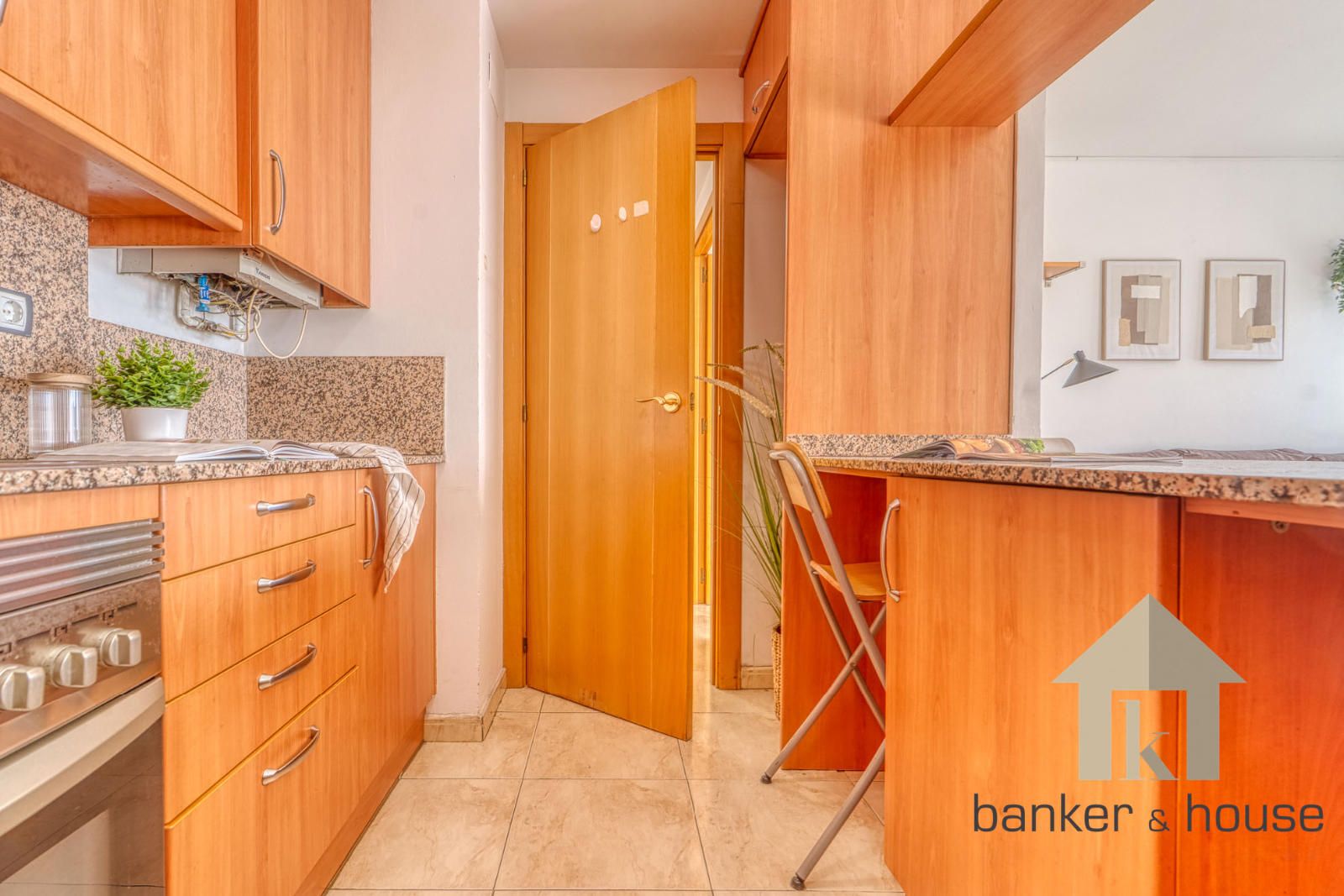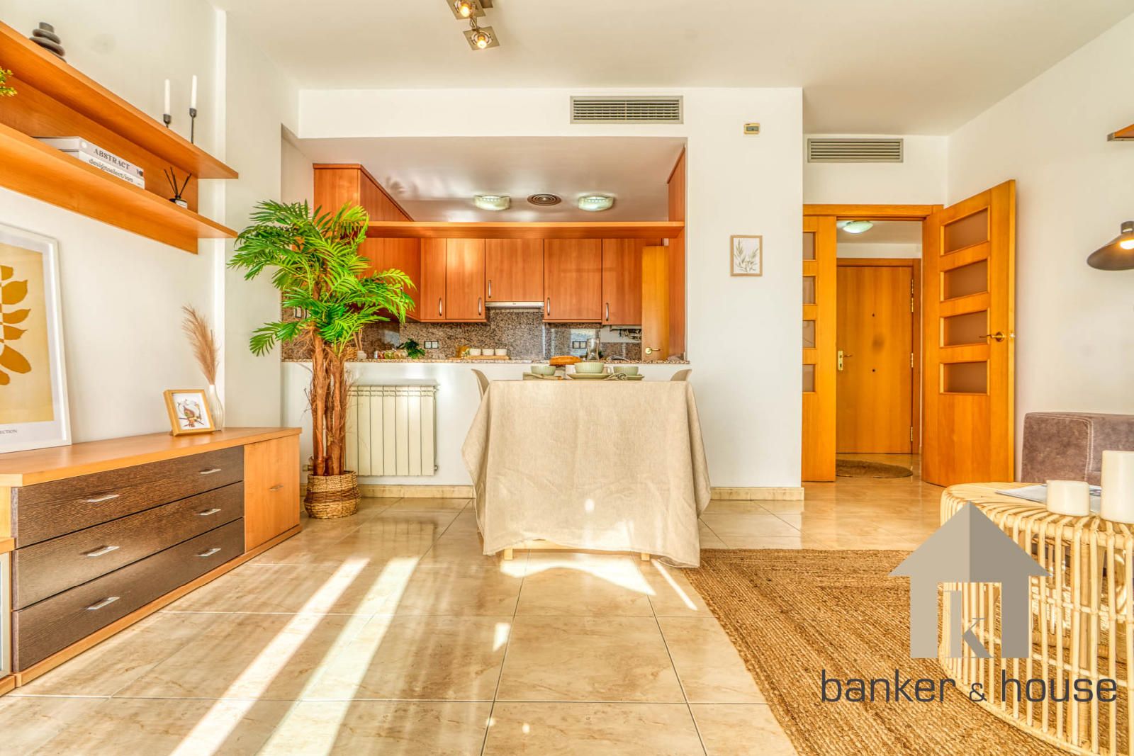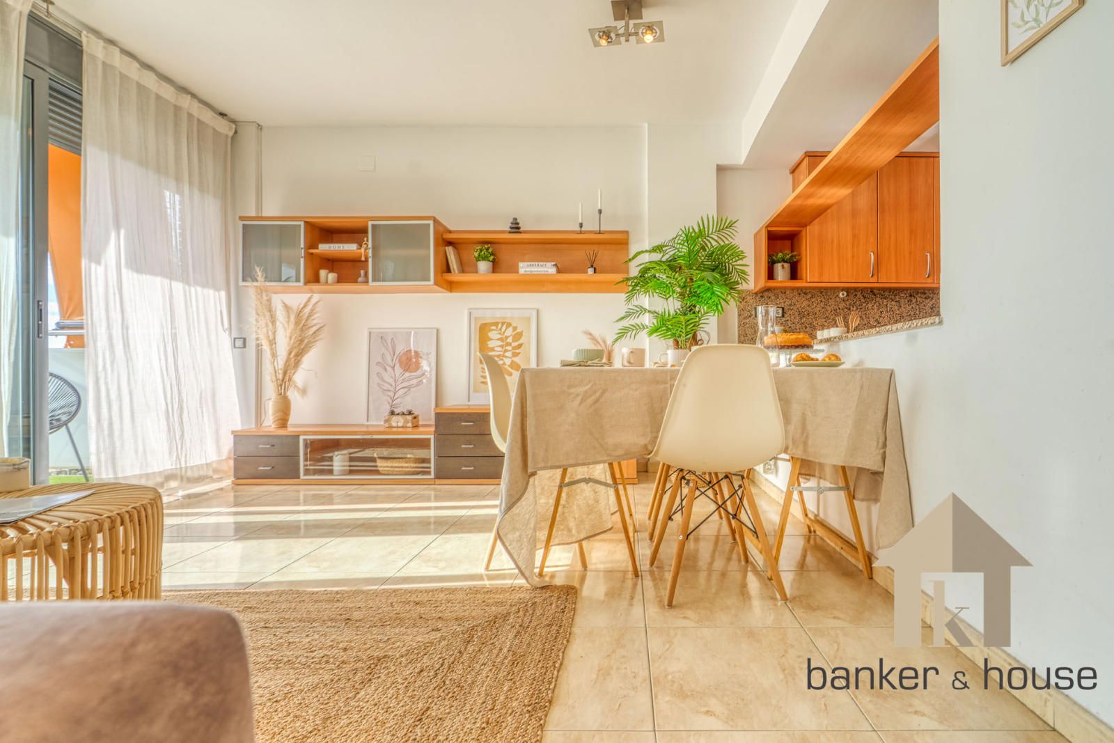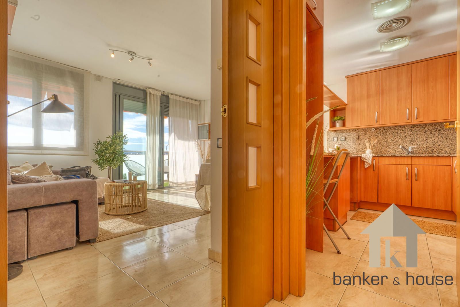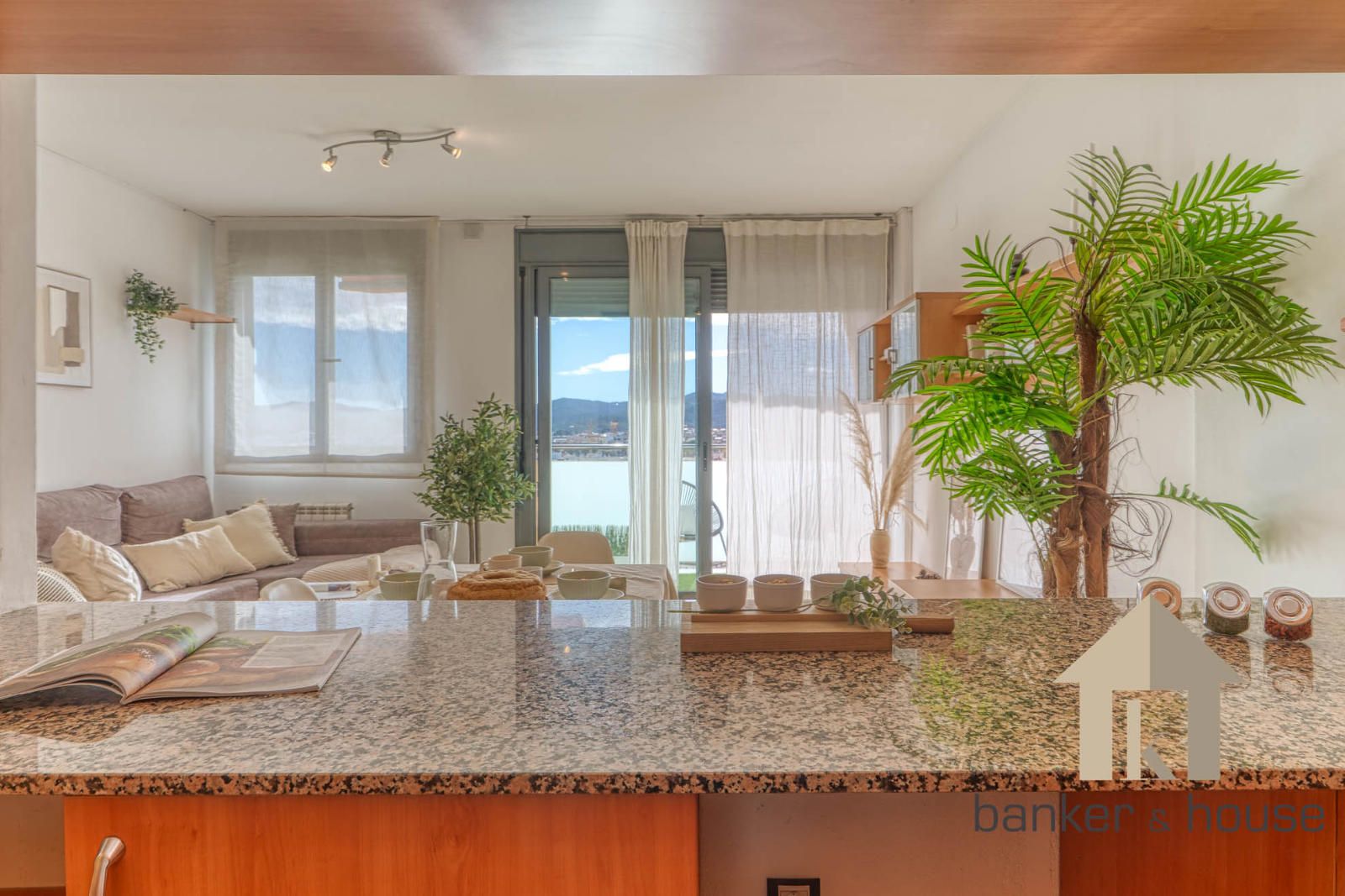La cocina es de tipo americano, abierta al salón mediante una barra que articula la zona de comedor. Está configurada con mobiliario en tres paredes, permitiendo una distribución funcional del espacio de trabajo. El salón, de geometría cuadrada, se organiza en dos ámbitos diferenciados: la zona de comedor próxima a la barra de la cocina y la zona de estar junto al ventanal principal. Desde este ventanal se accede al balcón-terraza, con capacidad para una pequeña zona de descanso y una mesa con sillas. Desde el exterior se observan vistas despejadas hacia el horizonte, con Collserola al fondo y el skyline de Cerdanyola en el centro.