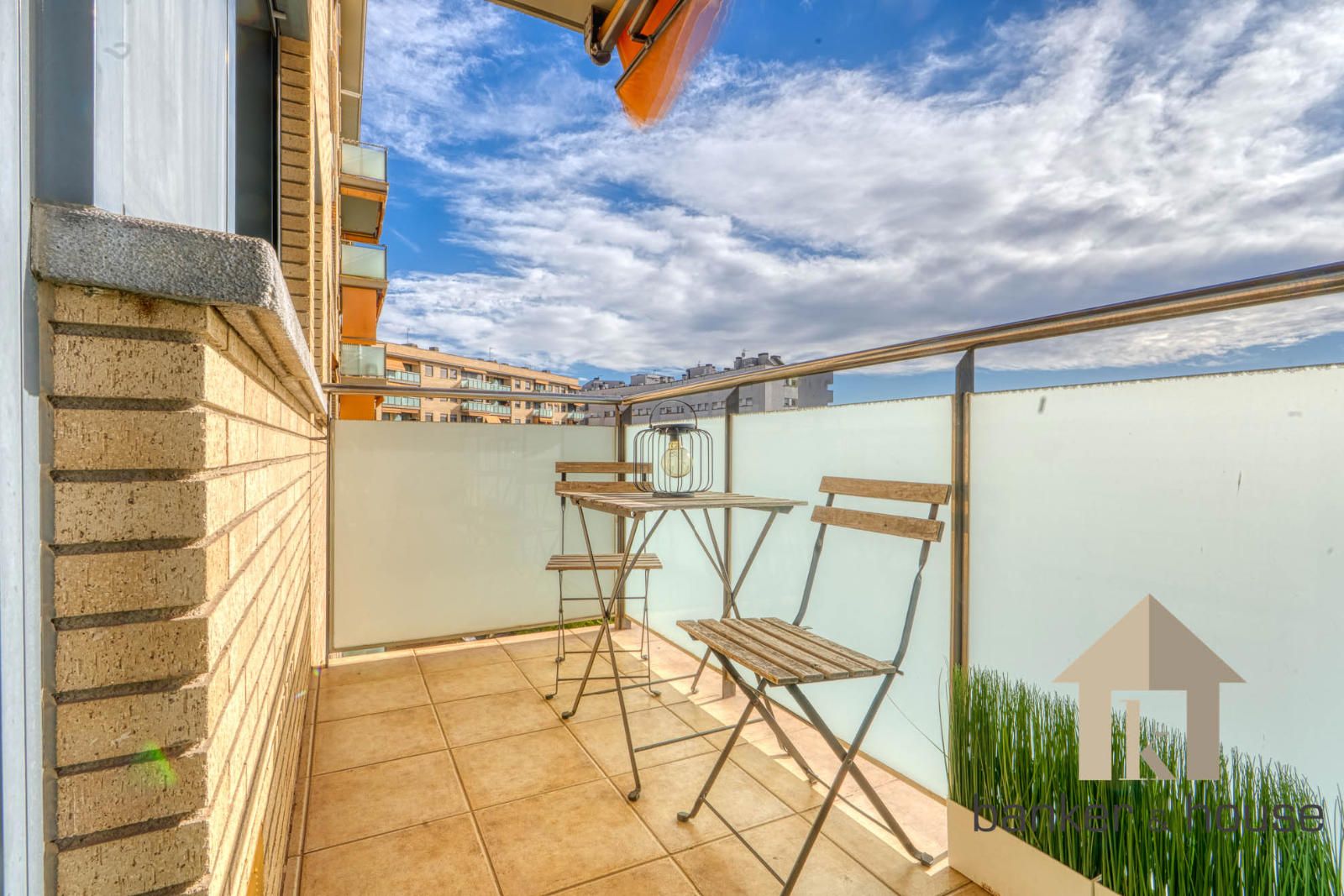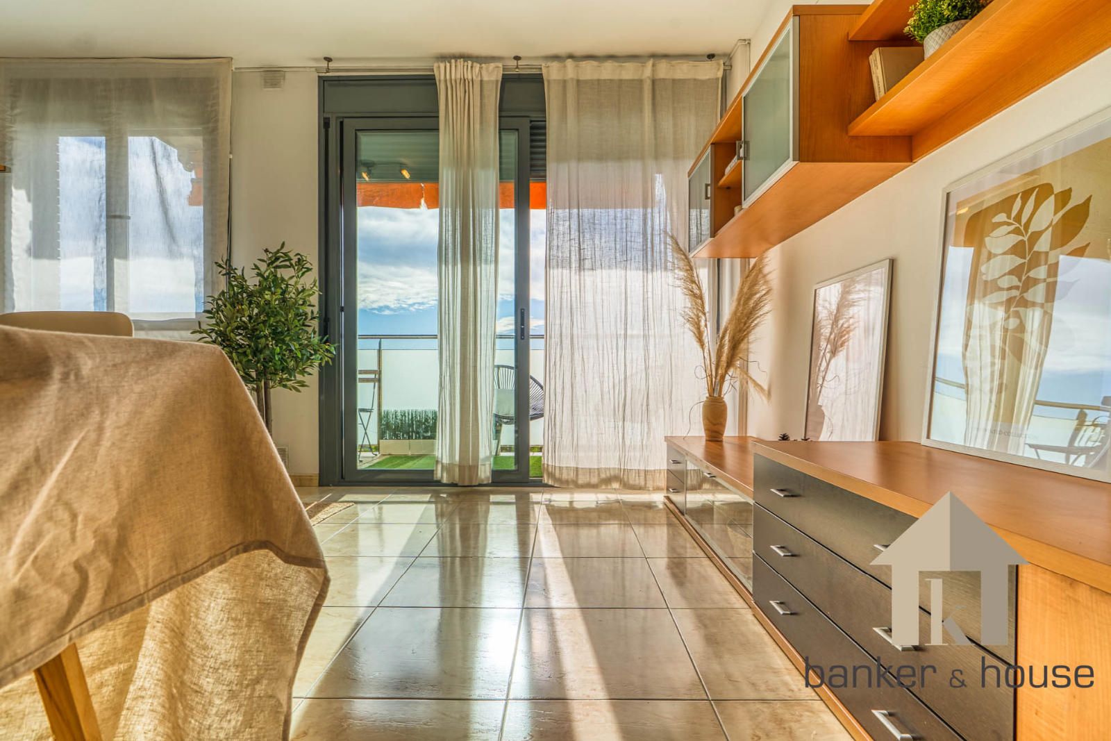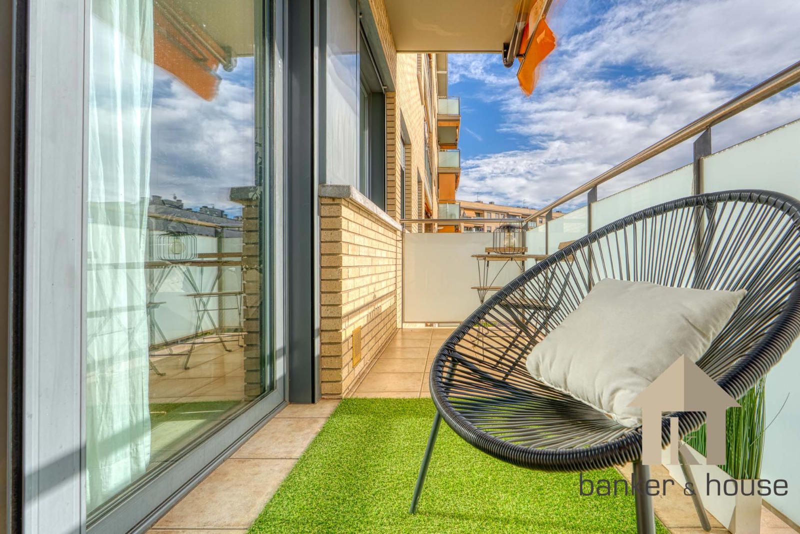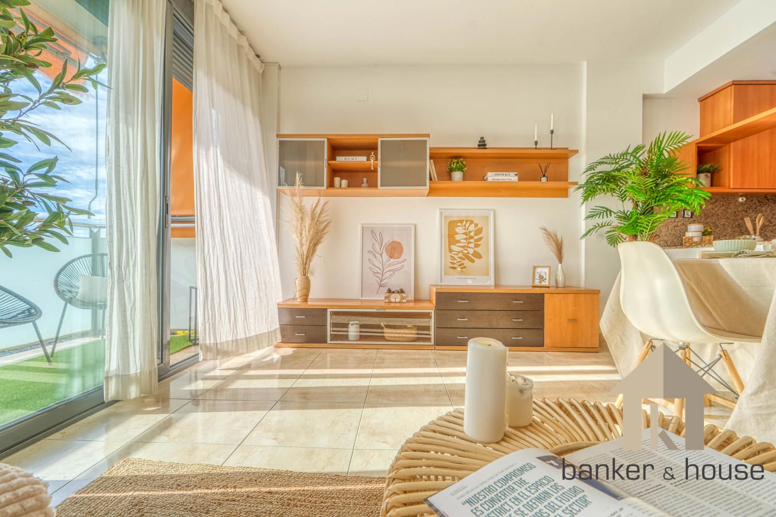 La cocina es de tipo americano, abierta al salón mediante una barra que articula la zona de comedor. Está configurada con mobiliario en tres paredes, permitiendo una distribución funcional del espacio de trabajo. El salón, de geometría cuadrada, se organiza en dos ámbitos diferenciados: la zona de comedor próxima a la barra de la cocina y la zona de estar junto al ventanal principal. Desde este ventanal se accede al balcón-terraza, con capacidad para una pequeña zona de descanso y una mesa con sillas. Desde el exterior se observan vistas despejadas hacia el horizonte, con Collserola al fondo y el skyline de Cerdanyola en el centro.