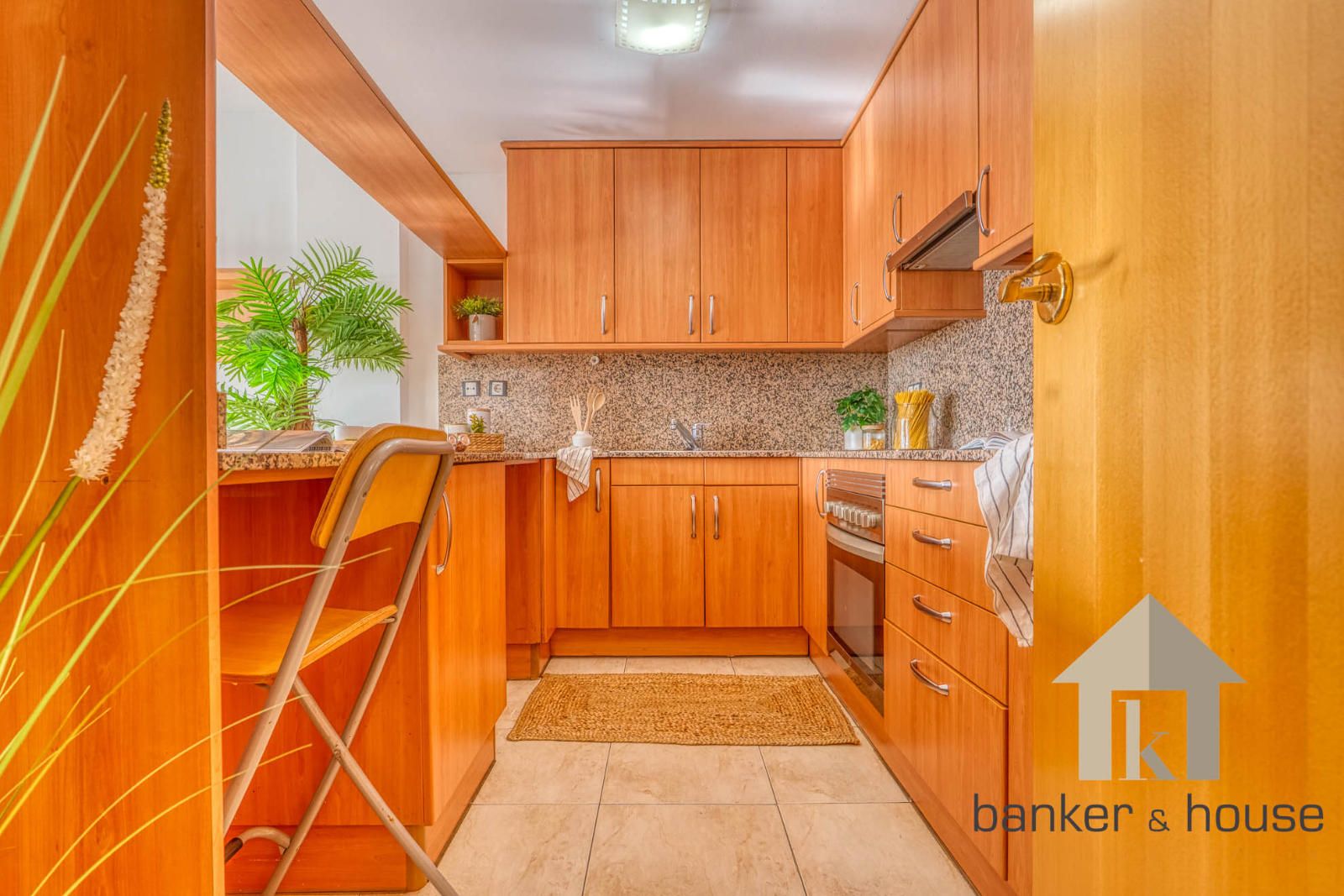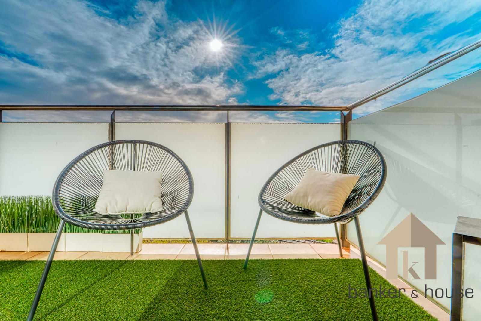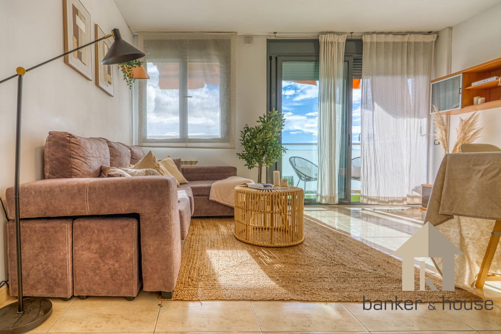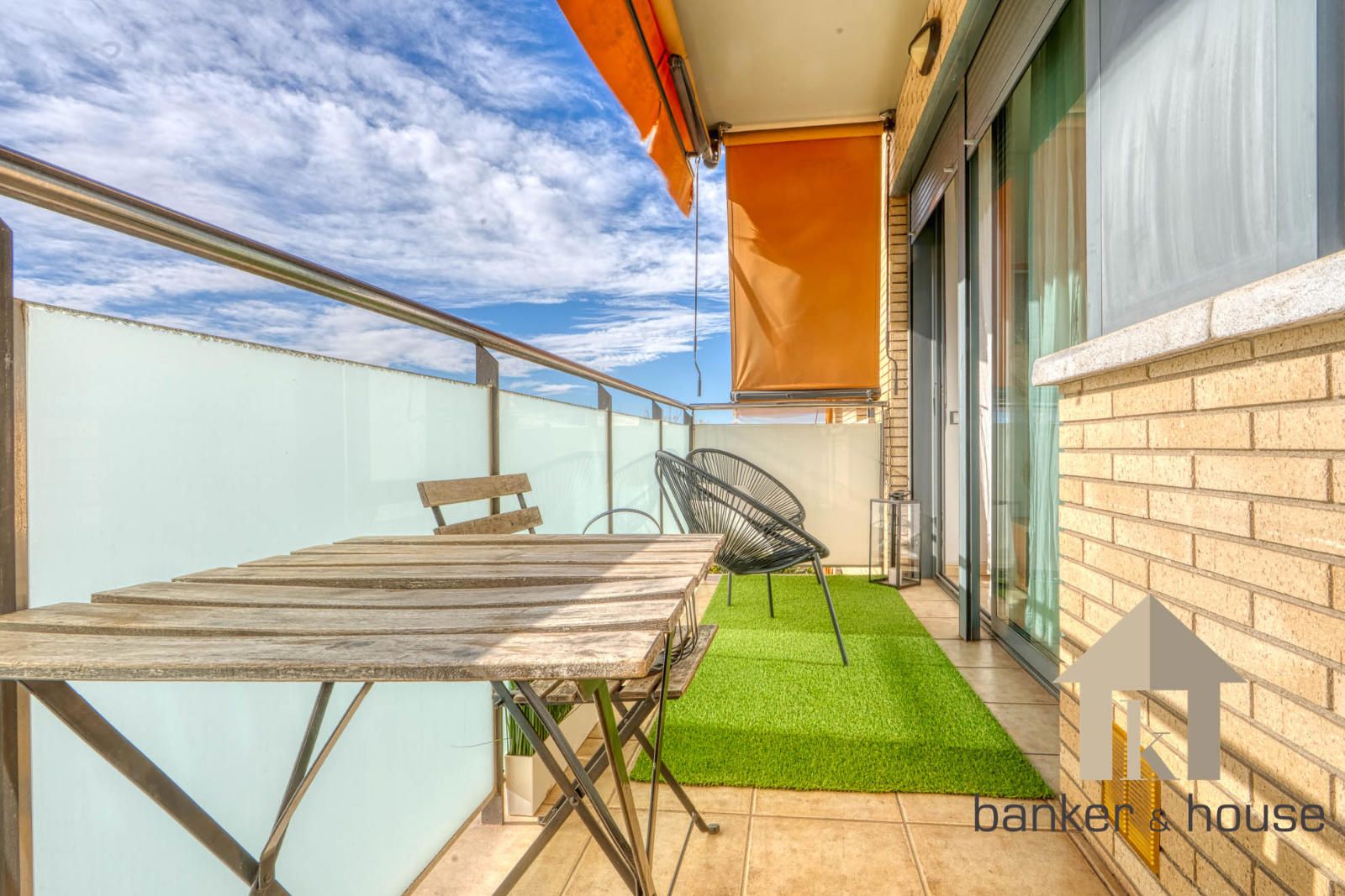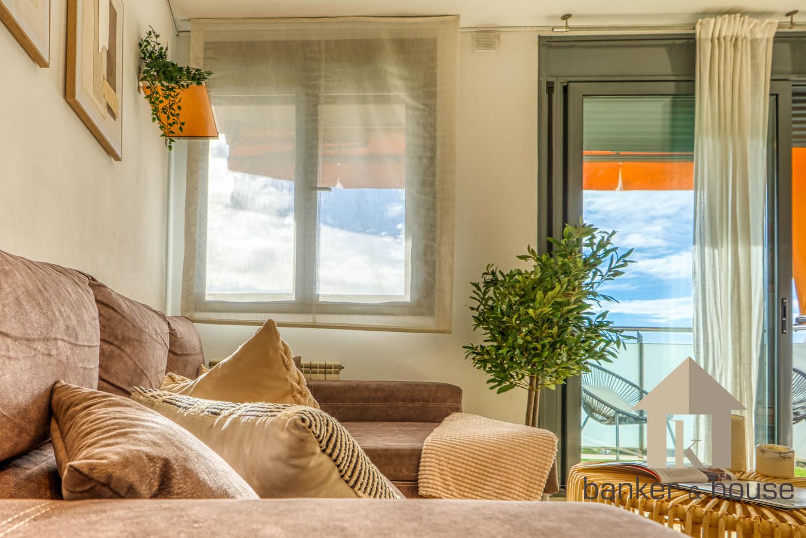 La cocina es de tipo americano, abierta al salón mediante una barra que articula la zona de comedor. Está configurada con mobiliario en tres paredes, permitiendo una distribución funcional del espacio de trabajo. El salón, de geometría cuadrada, se organiza en dos ámbitos diferenciados: la zona de comedor próxima a la barra de la cocina y la zona de estar junto al ventanal principal. Desde este ventanal se accede al balcón-terraza, con capacidad para una pequeña zona de descanso y una mesa con sillas. Desde el exterior se observan vistas despejadas hacia el horizonte, con Collserola al fondo y el skyline de Cerdanyola en el centro.