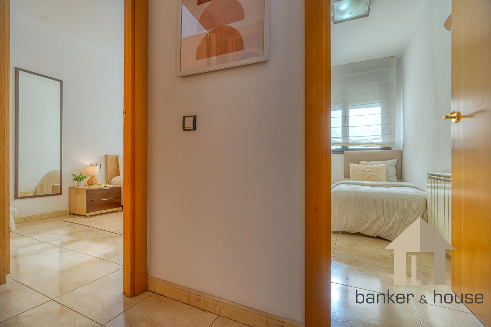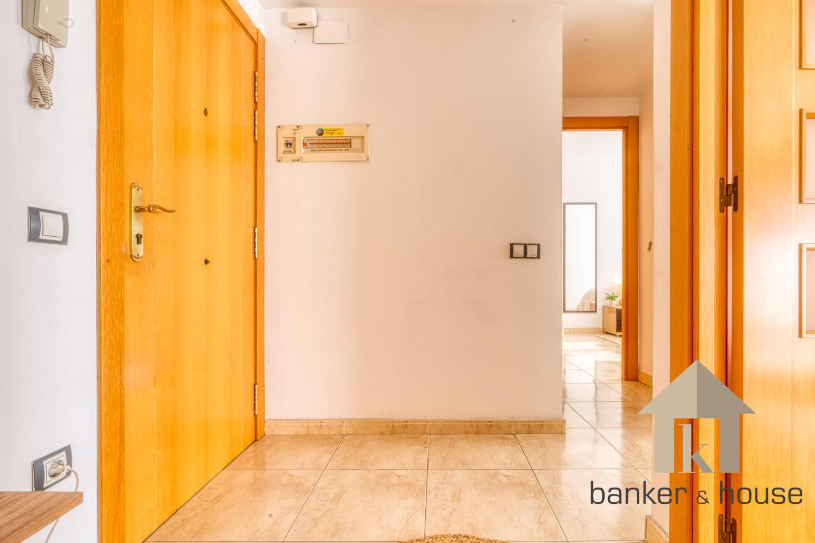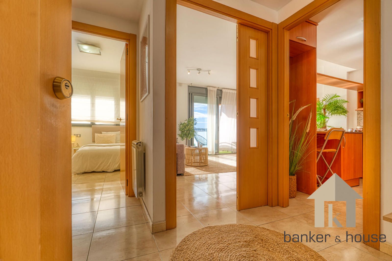 El acceso se realiza a través de un recibidor único que actúa como distribuidor central. Este espacio organiza la circulación interior y separa la zona de habitaciones del salón y la cocina, optimizando la superficie útil. Tanto el salón como las dos habitaciones se orientan al sur, lo que aporta una elevada entrada de luz natural durante la mayor parte del día.
