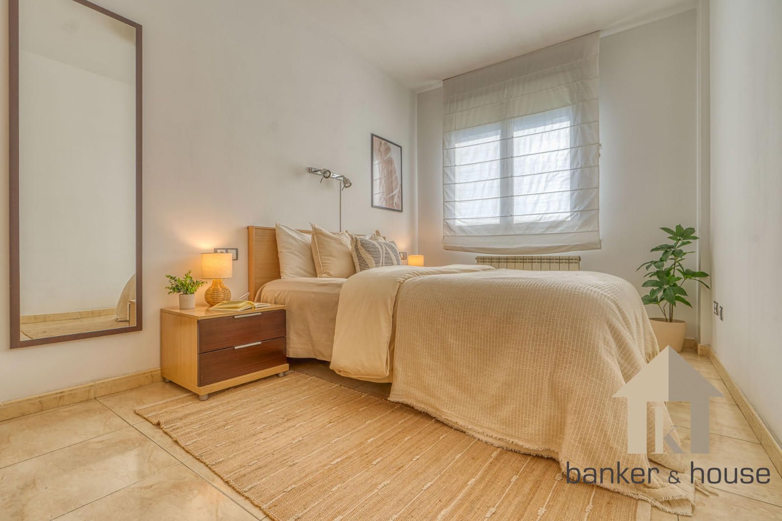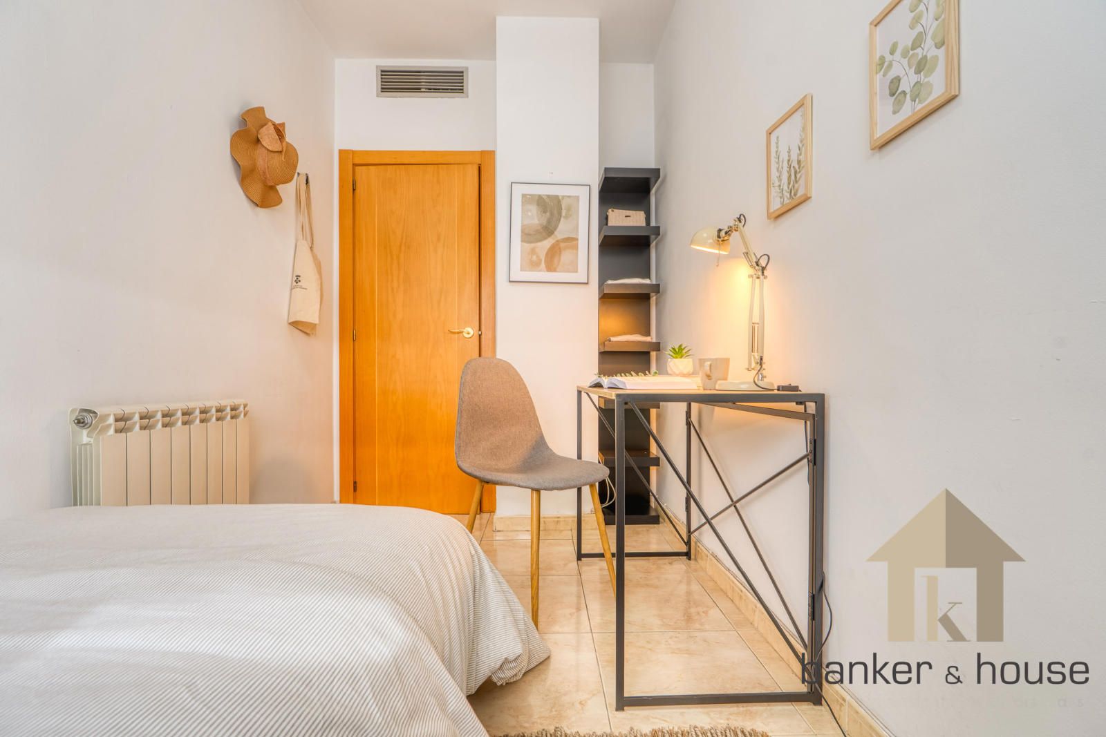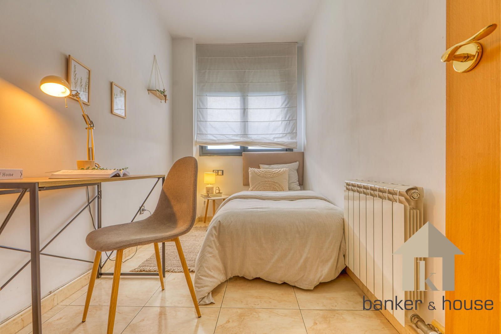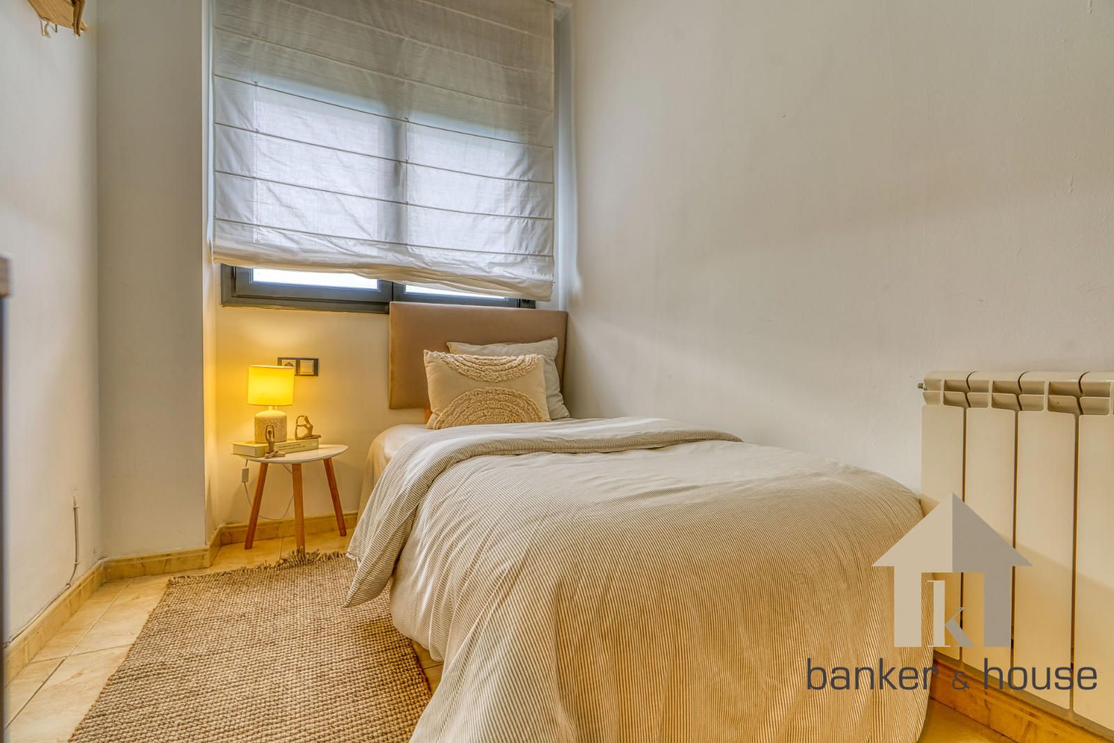 La vivienda incluye una habitación principal de alrededor de trece metros y una habitación individual. El baño es completo, de cuatro piezas, equipado con bañera. Entre los acabados destacan el pavimento cerámico, carpintería interior en haya y carpintería exterior de aluminio en gris oscuro. El sistema de climatización funciona por conductos de frío y calor.