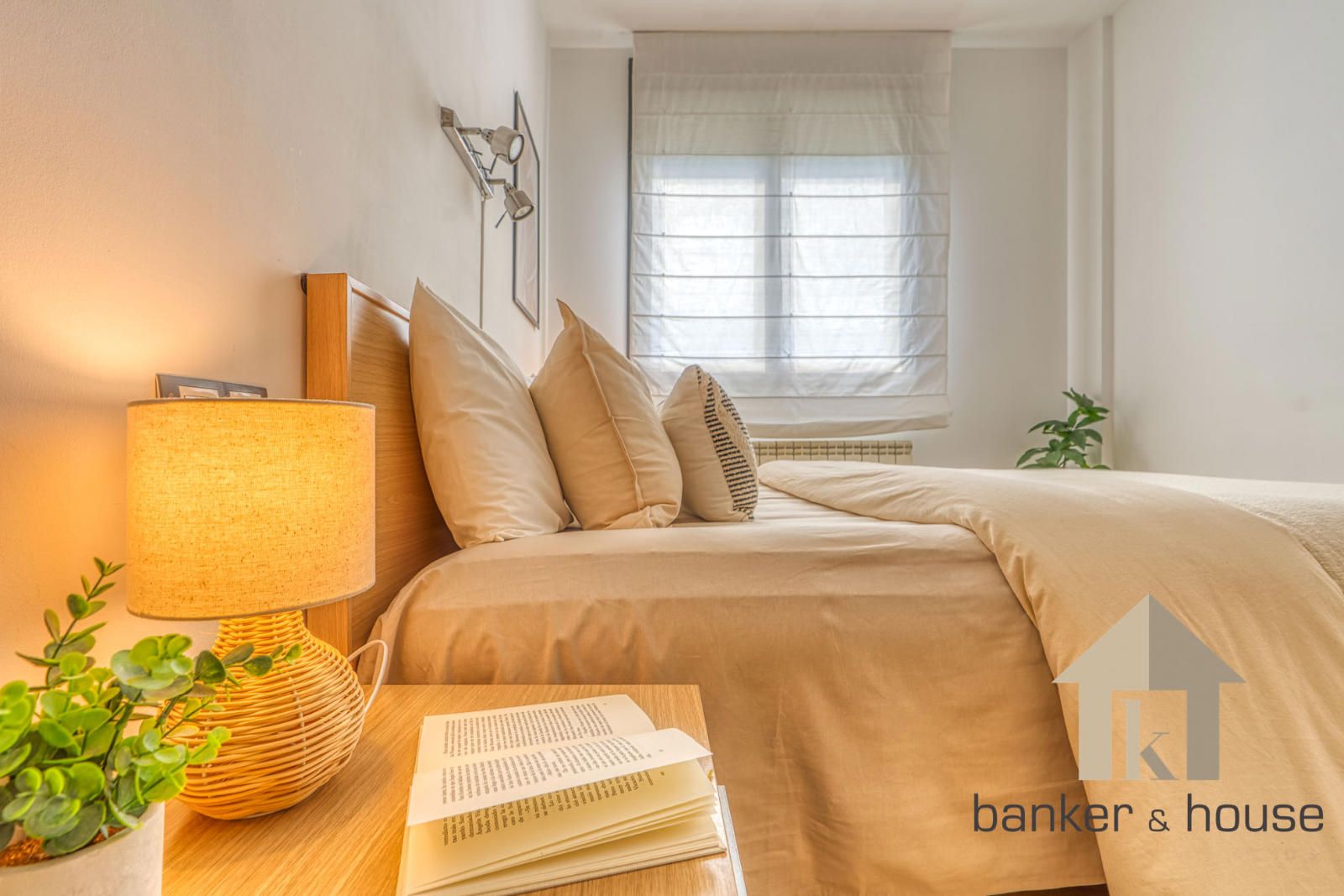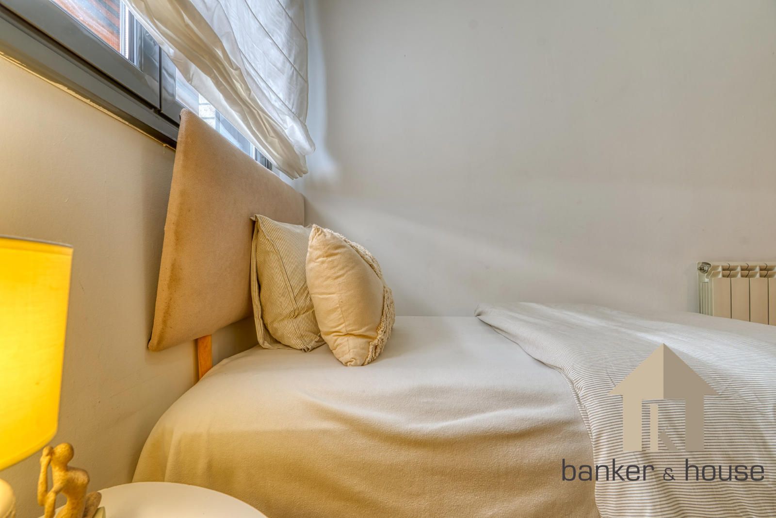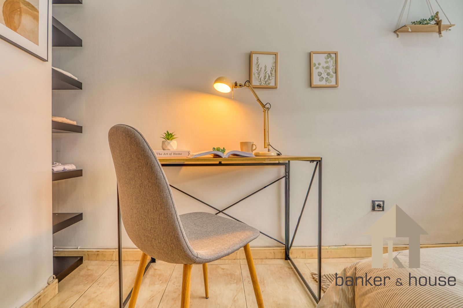 La vivienda incluye una habitación principal de alrededor de trece metros y una habitación individual. El baño es completo, de cuatro piezas, equipado con bañera. Entre los acabados destacan el pavimento cerámico, carpintería interior en haya y carpintería exterior de aluminio en gris oscuro. El sistema de climatización funciona por conductos de frío y calor.
