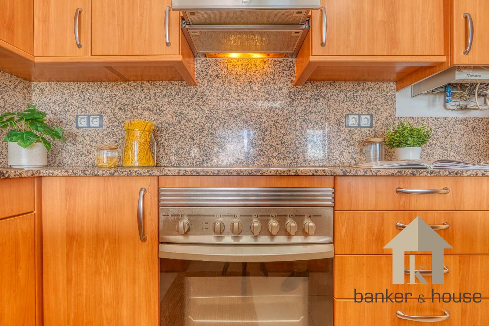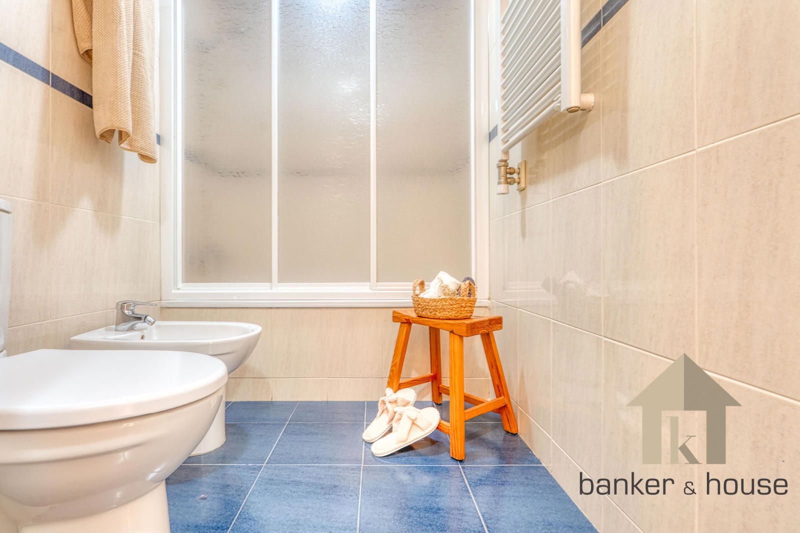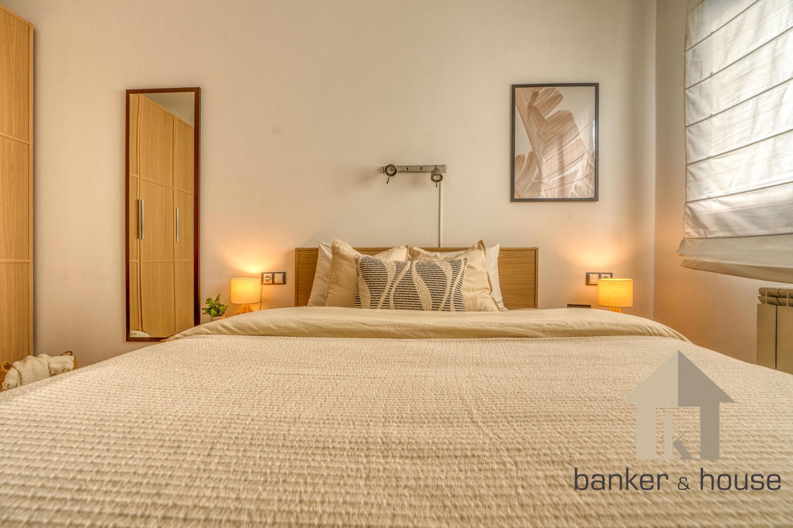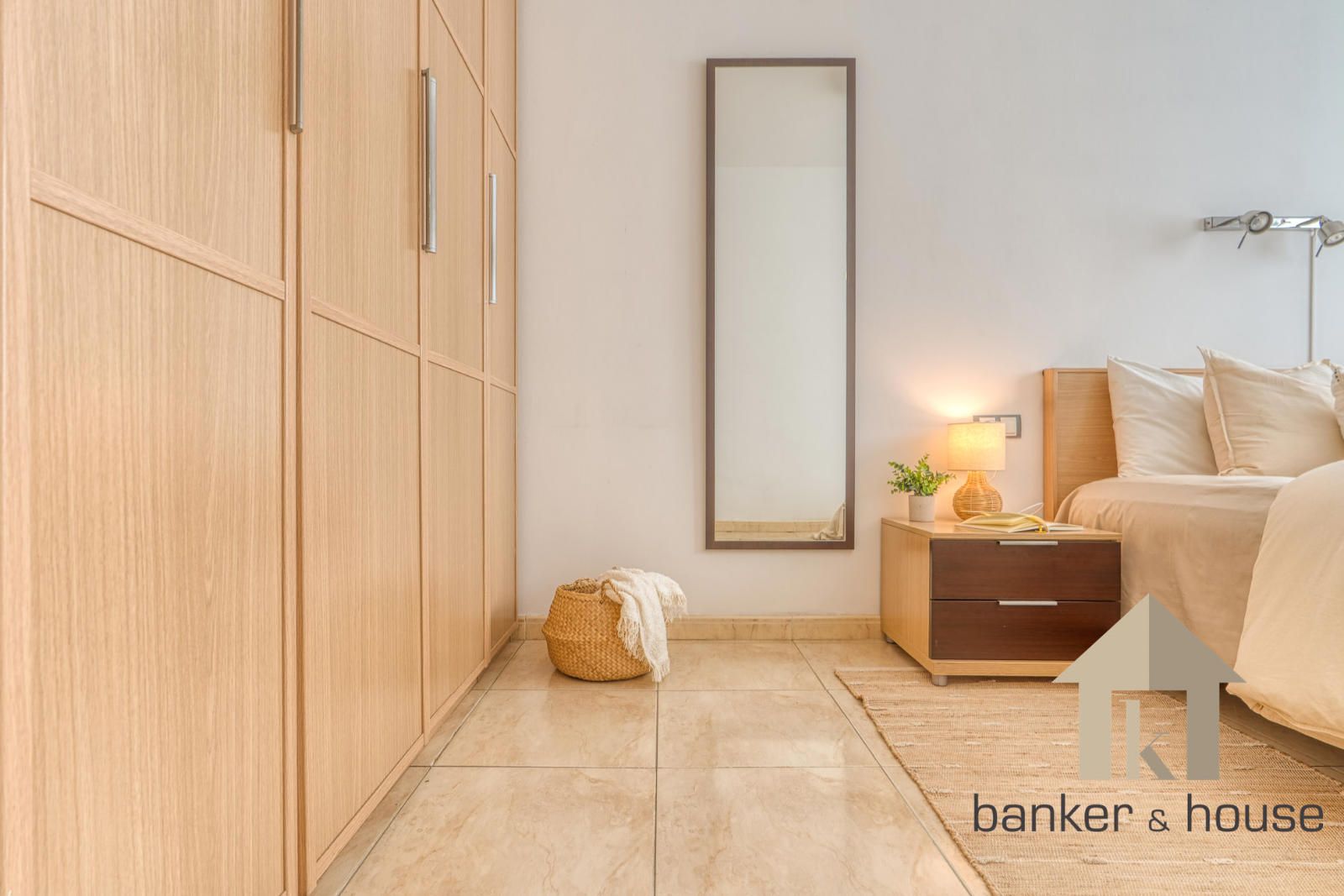 La vivienda incluye una habitación principal de alrededor de trece metros y una habitación individual. El baño es completo, de cuatro piezas, equipado con bañera. Entre los acabados destacan el pavimento cerámico, carpintería interior en haya y carpintería exterior de aluminio en gris oscuro. El sistema de climatización funciona por conductos de frío y calor.