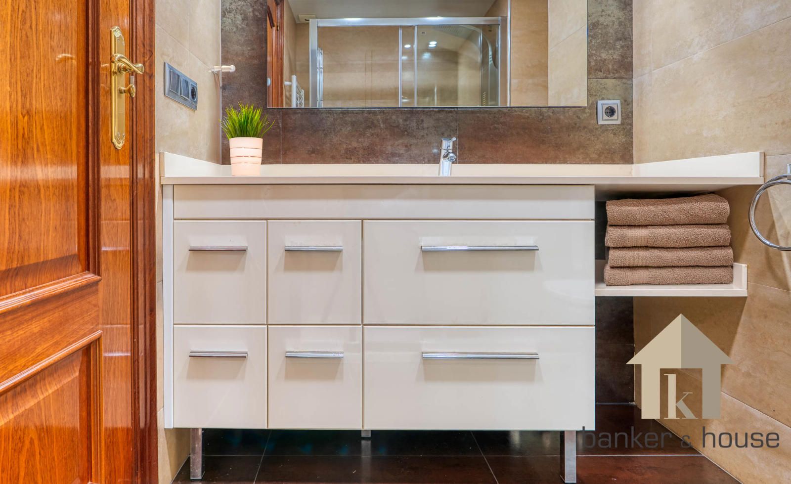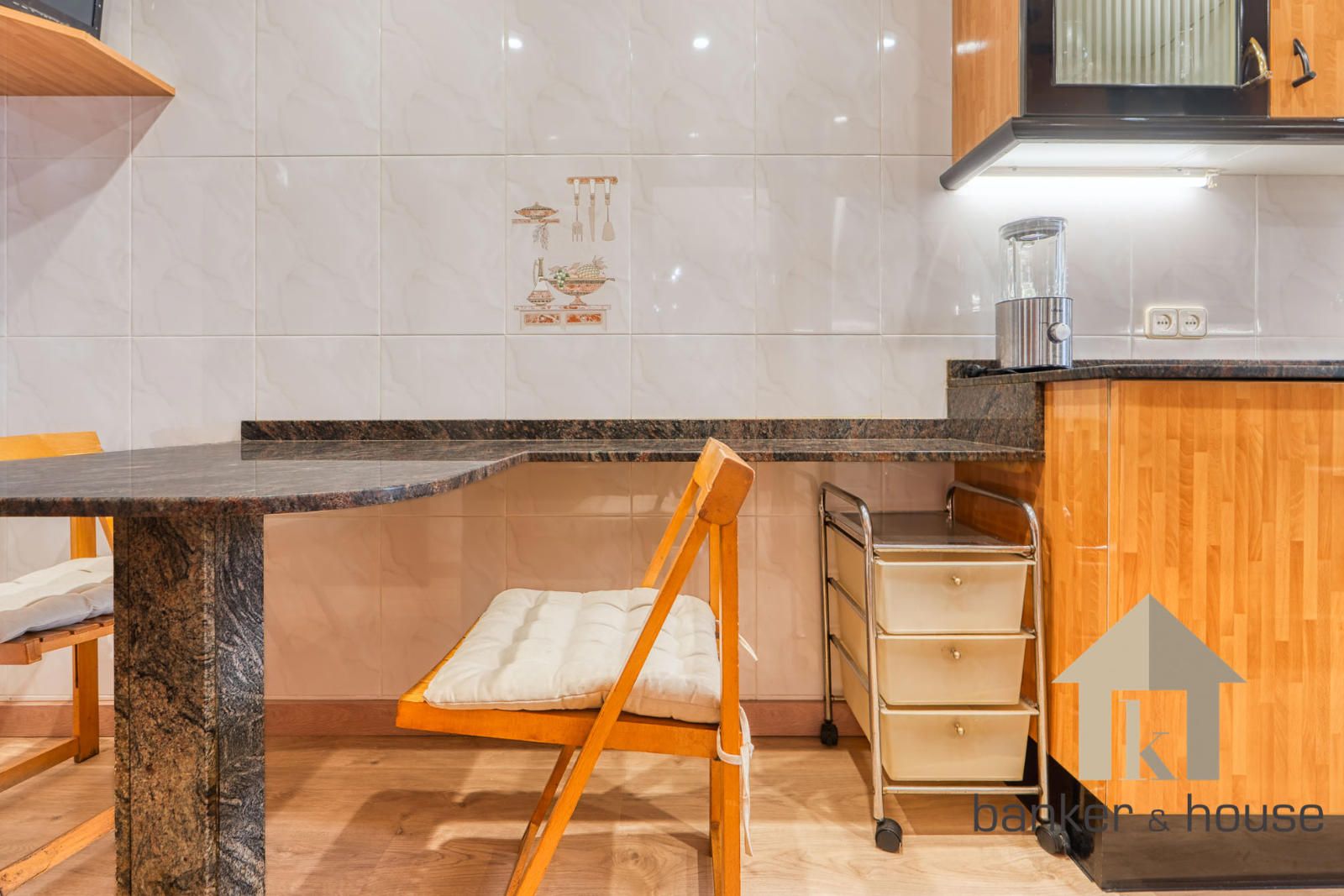 La cocina, reformada y de forma rectangular, cuenta con mobiliario a dos paredes y puerta corredera hacia el comedor. Dispone de una zona de office para desayunos o comidas diarias y al fondo un lavadero independiente donde se ubica la caldera de gas.
