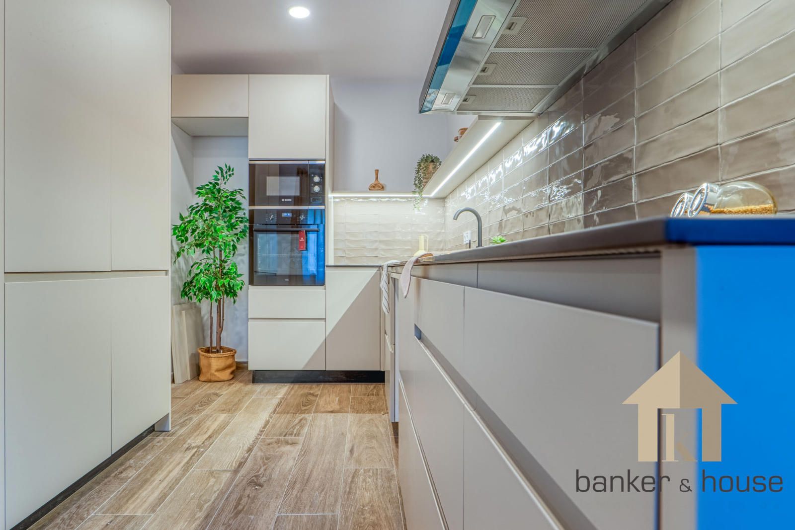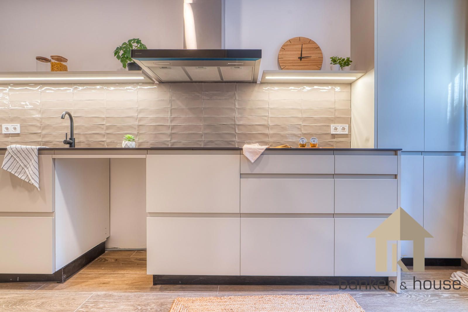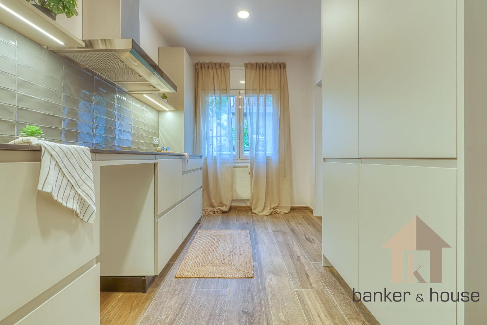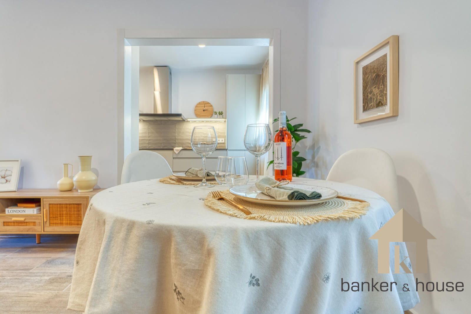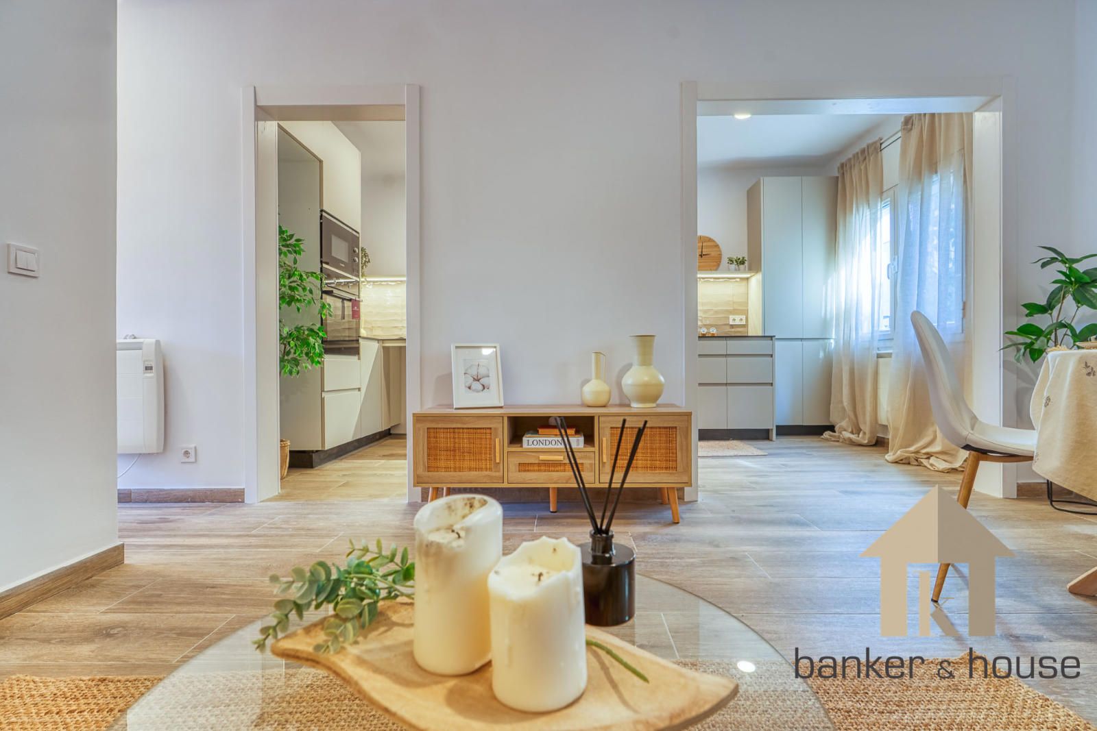 La cocina queda vinculada al salón mediante dos accesos sin puerta, ofreciendo una conexión fluida pero manteniendo un cierto grado de independencia funcional. El mobiliario se distribuye principalmente en la zona baja y en un murete frontal, con espacio para nevera, lavadora y lavavajillas. Junto al ventanal se ubica una zona de office. La cocina comunica directamente con el salón, que actúa como núcleo de la vivienda por su superficie y configuración cuadrada. Este espacio admite varias zonas diferenciadas: área de sofá, zona de comedor, espacio para entretenimiento y pasos distribuidos hacia el resto de estancias.