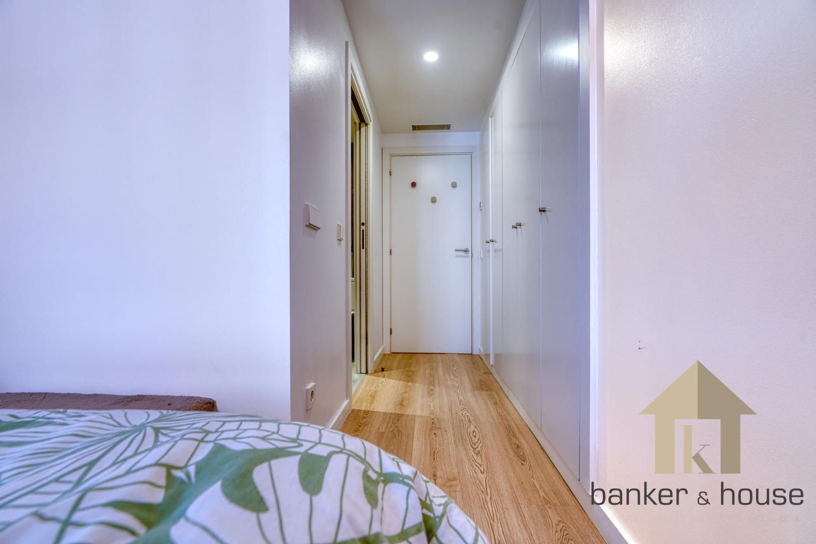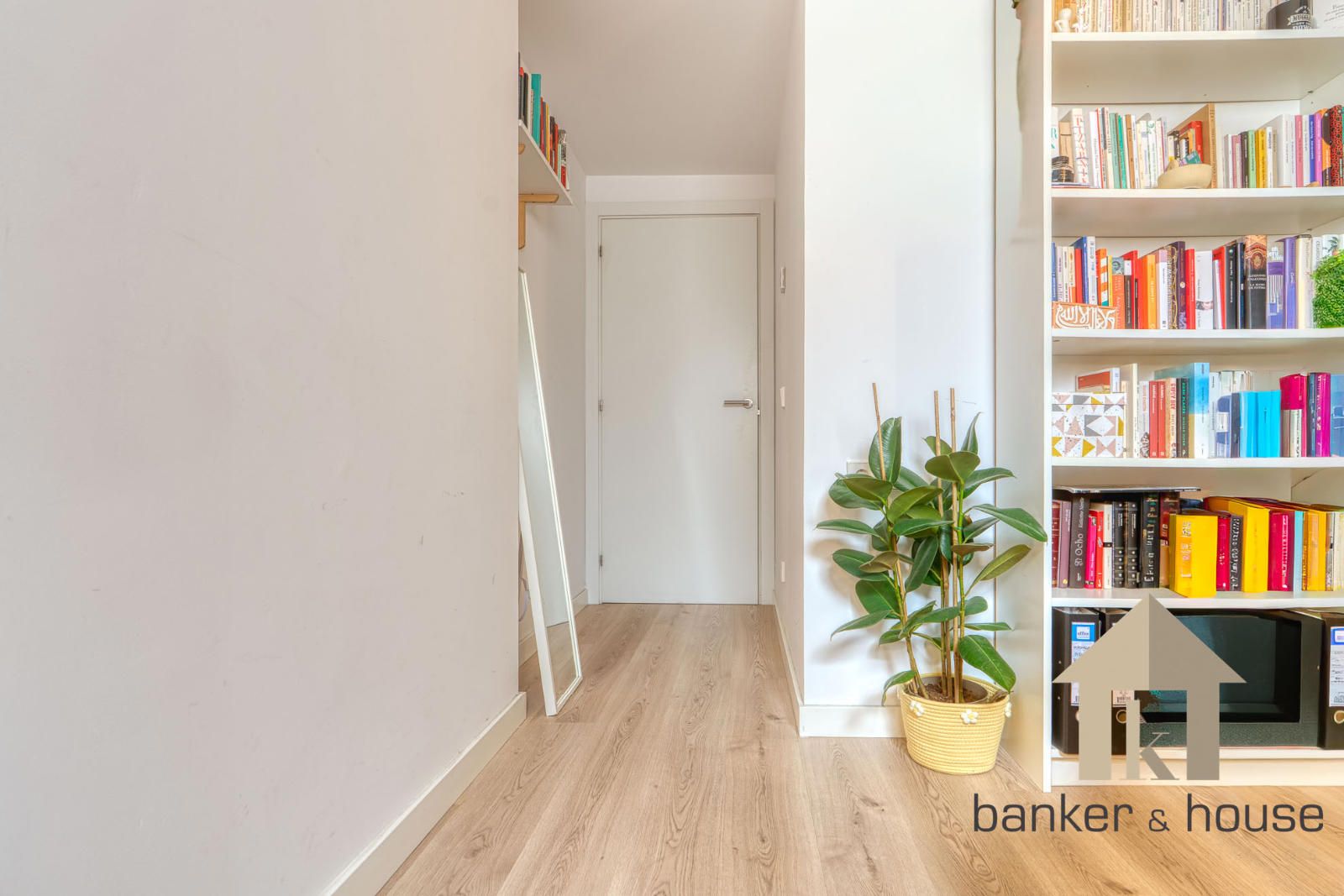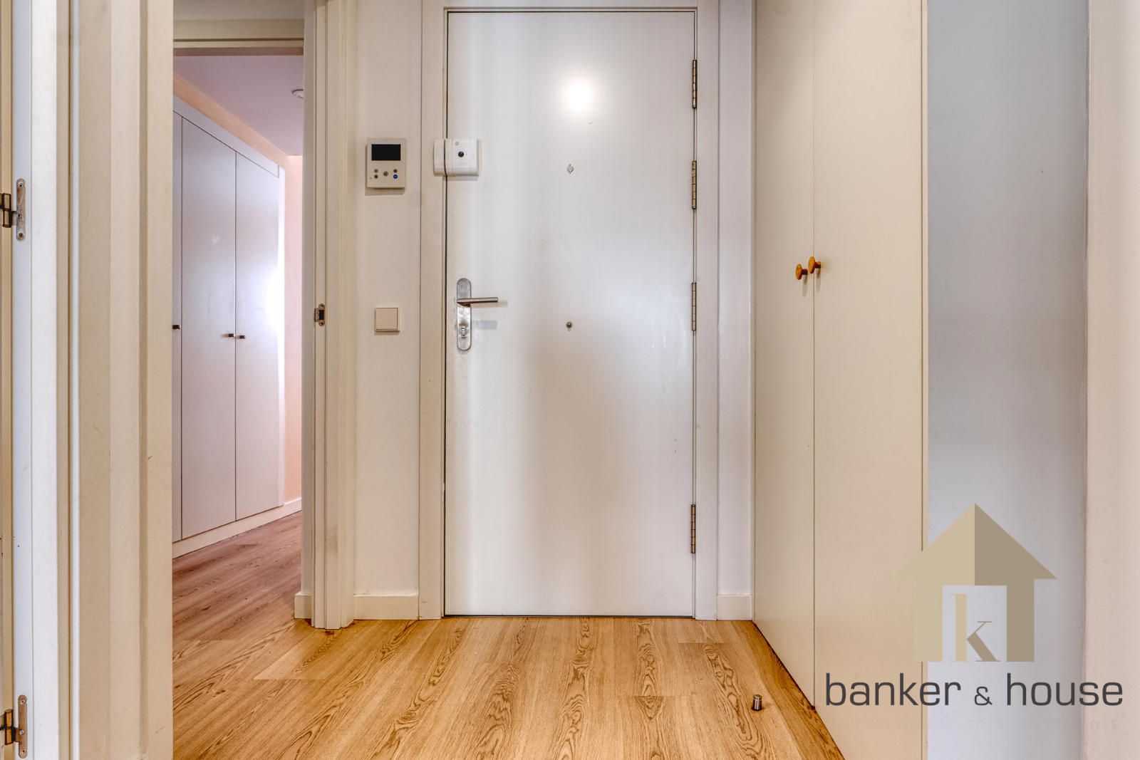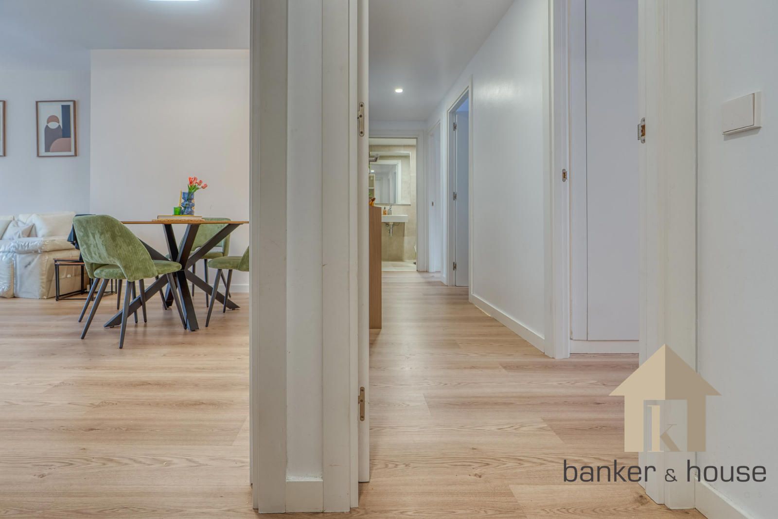 El acceso se realiza desde un rellano con doble puerta de seguridad. Tras la entrada, un recibidor central articula la vivienda y distribuye las distintas piezas. A un lado se sitúa la cocina y al otro el salón, con una disposición que separa ambas estancias desde el primer tramo de acceso. Esta organización permite una lectura clara del piso desde el vestíbulo y ordena el recorrido hacia la zona de habitaciones, situada de forma independiente respecto de las estancias principales.
