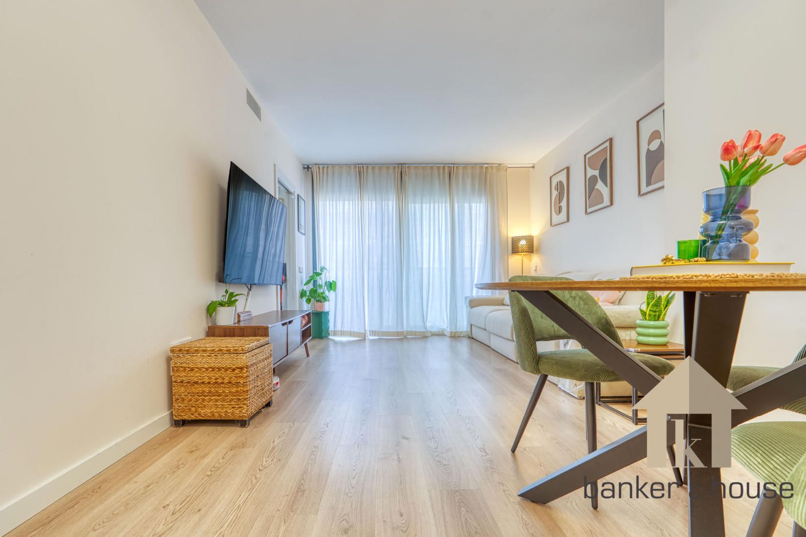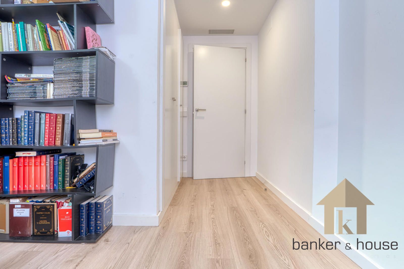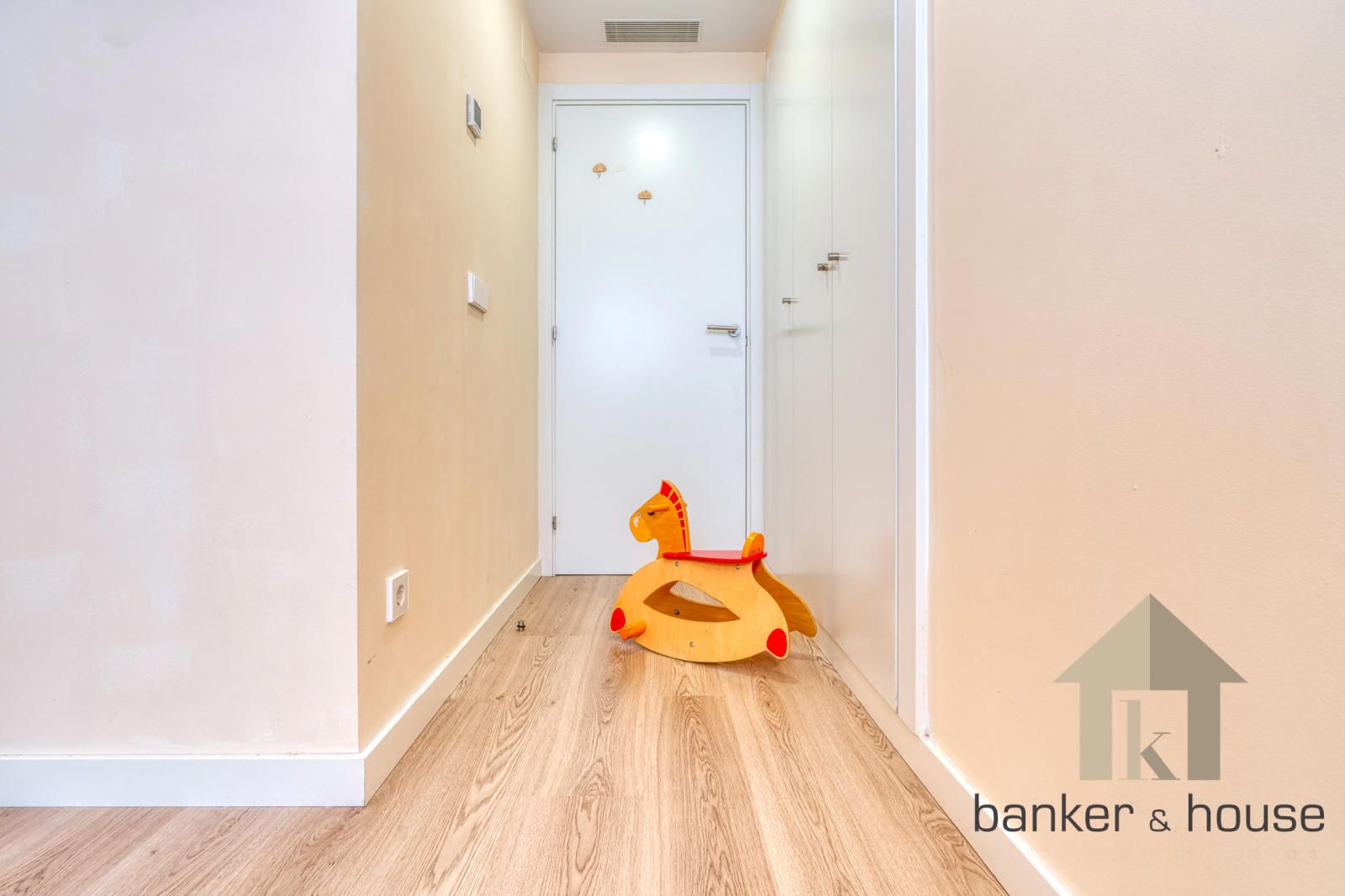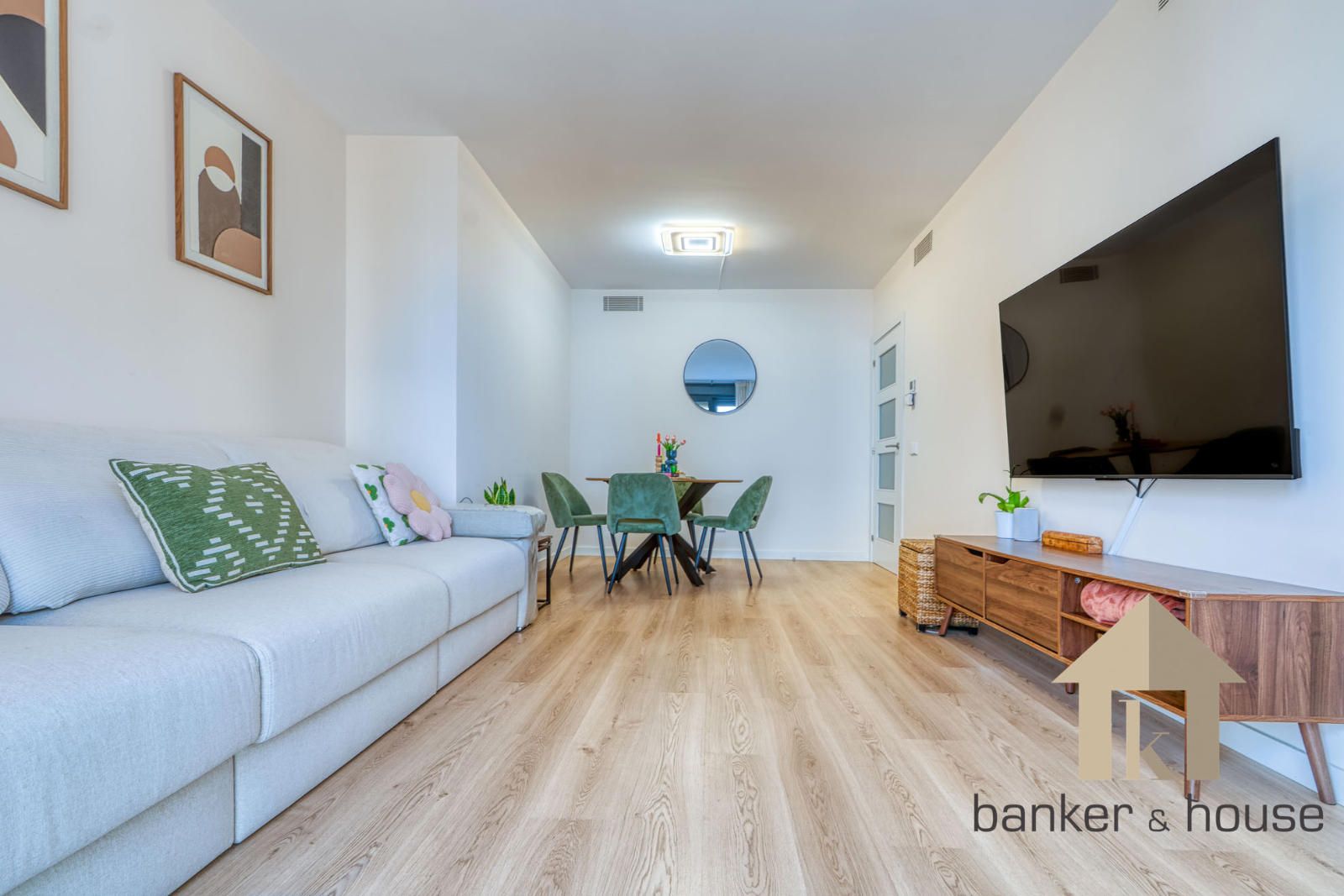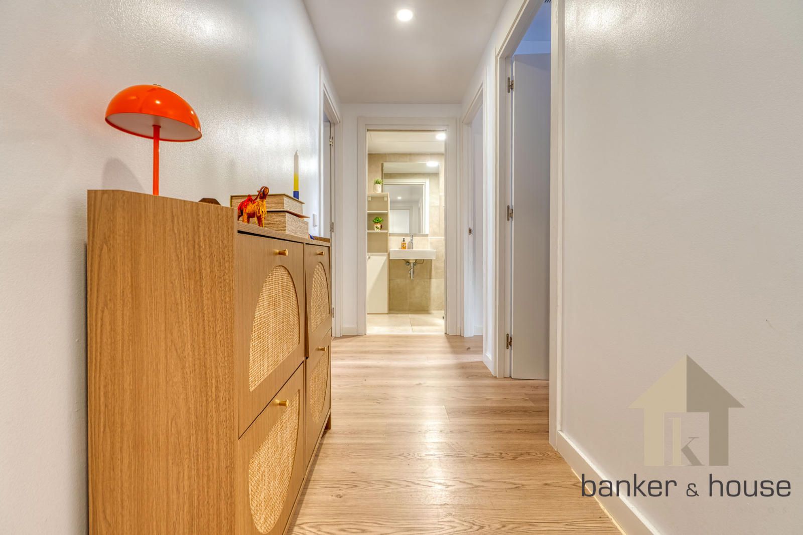 El acceso se realiza desde un rellano con doble puerta de seguridad. Tras la entrada, un recibidor central articula la vivienda y distribuye las distintas piezas. A un lado se sitúa la cocina y al otro el salón, con una disposición que separa ambas estancias desde el primer tramo de acceso. Esta organización permite una lectura clara del piso desde el vestíbulo y ordena el recorrido hacia la zona de habitaciones, situada de forma independiente respecto de las estancias principales.