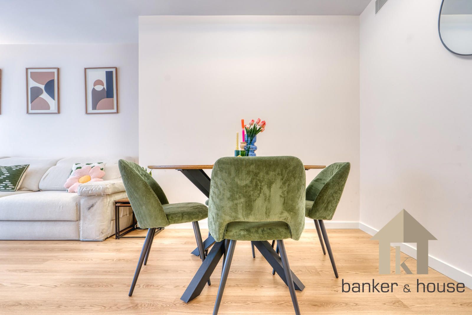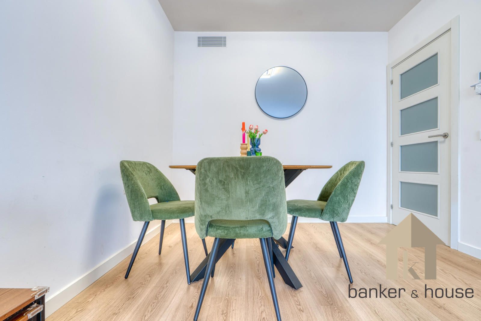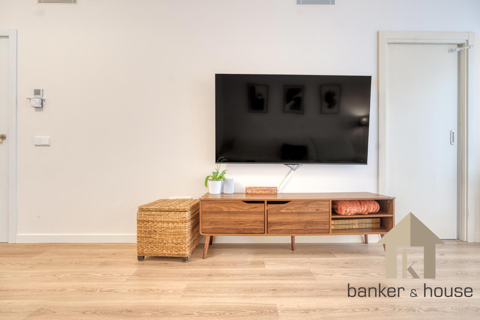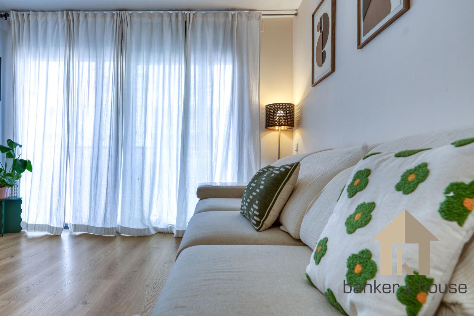 El acceso se realiza desde un rellano con doble puerta de seguridad. Tras la entrada, un recibidor central articula la vivienda y distribuye las distintas piezas. A un lado se sitúa la cocina y al otro el salón, con una disposición que separa ambas estancias desde el primer tramo de acceso. Esta organización permite una lectura clara del piso desde el vestíbulo y ordena el recorrido hacia la zona de habitaciones, situada de forma independiente respecto de las estancias principales.