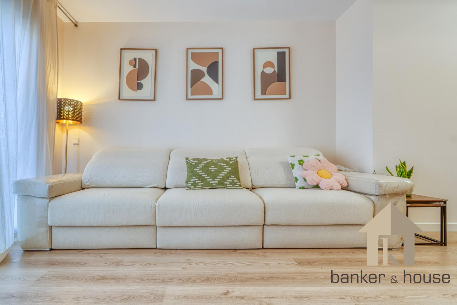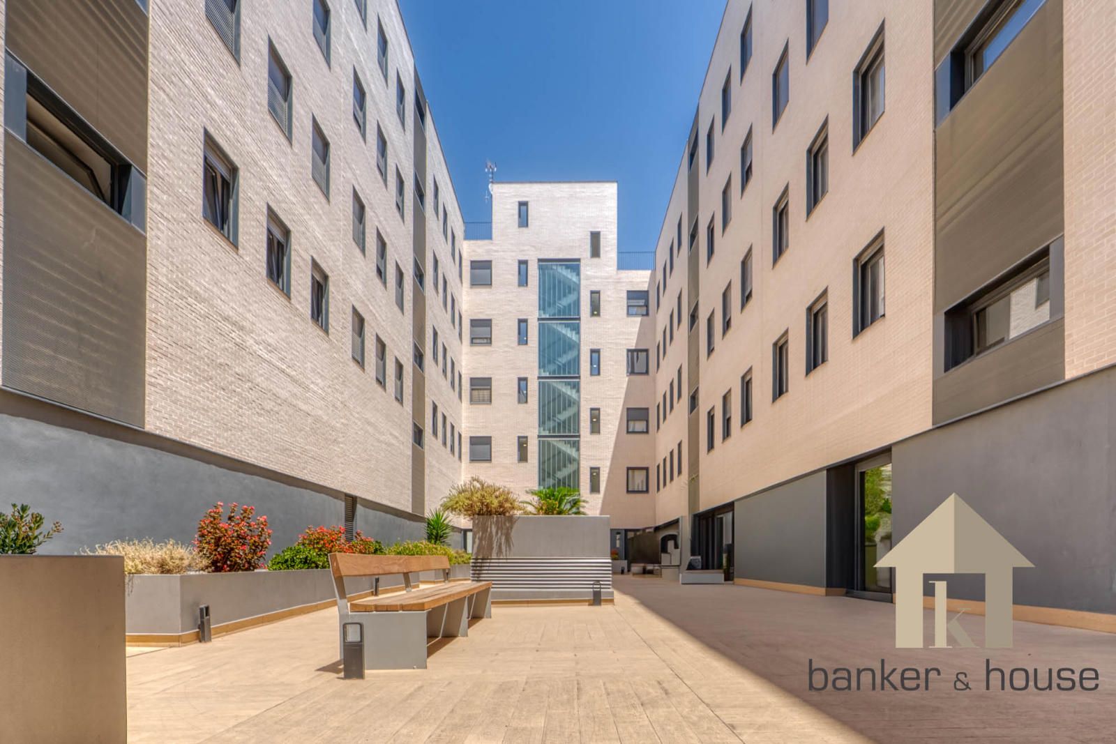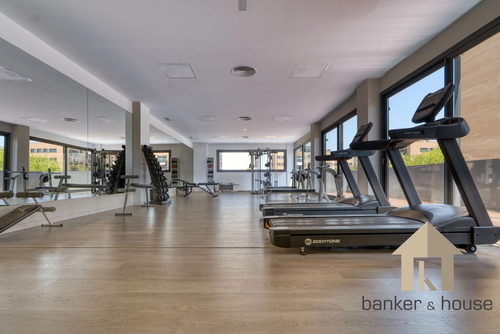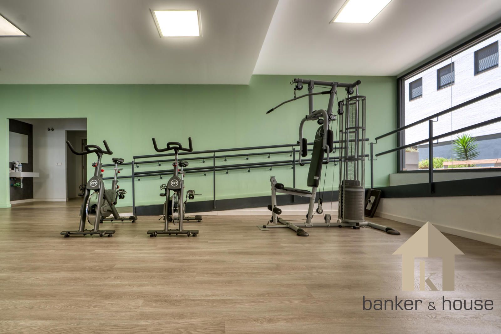 El balcón se integra como salida exterior vinculada a la vivienda. La vivienda se completa con plaza de parking, trastero y acceso a gimnasio comunitario, manteniendo una organización general en la que la planta reúne las estancias interiores y la salida exterior se resuelve mediante el balcón como pieza complementaria del conjunto.