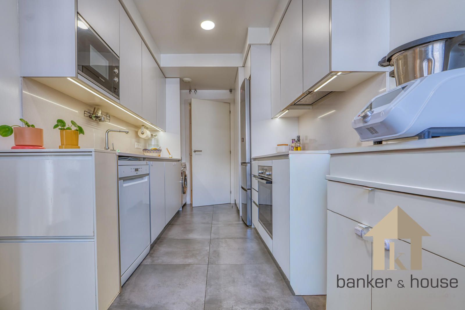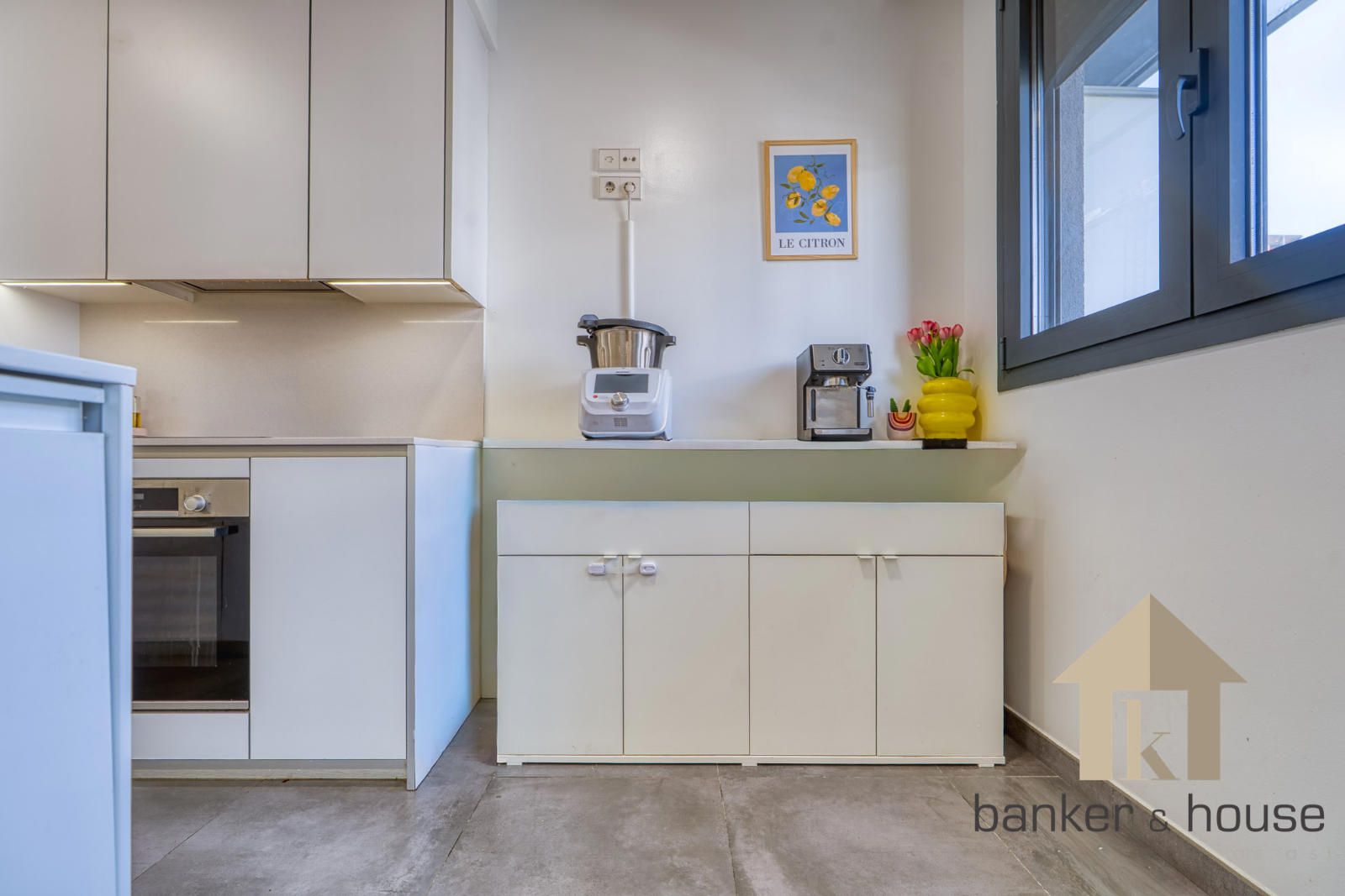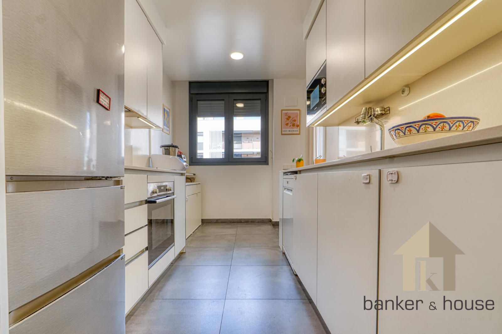 La cocina se dispone en dos frentes de mobiliario, con superficie de trabajo y almacenaje en ambos lados. Integra la zona técnica de aerotermia y, al fondo, junto al ventanal, incorpora una zona office. Desde esta estancia se accede al salón mediante puerta corredera. El salón tiene planta rectangular y se abre al exterior a través de un ventanal de gran formato. La conexión entre cocina y salón se resuelve mediante este paso directo, manteniendo cada estancia delimitada dentro del conjunto.
