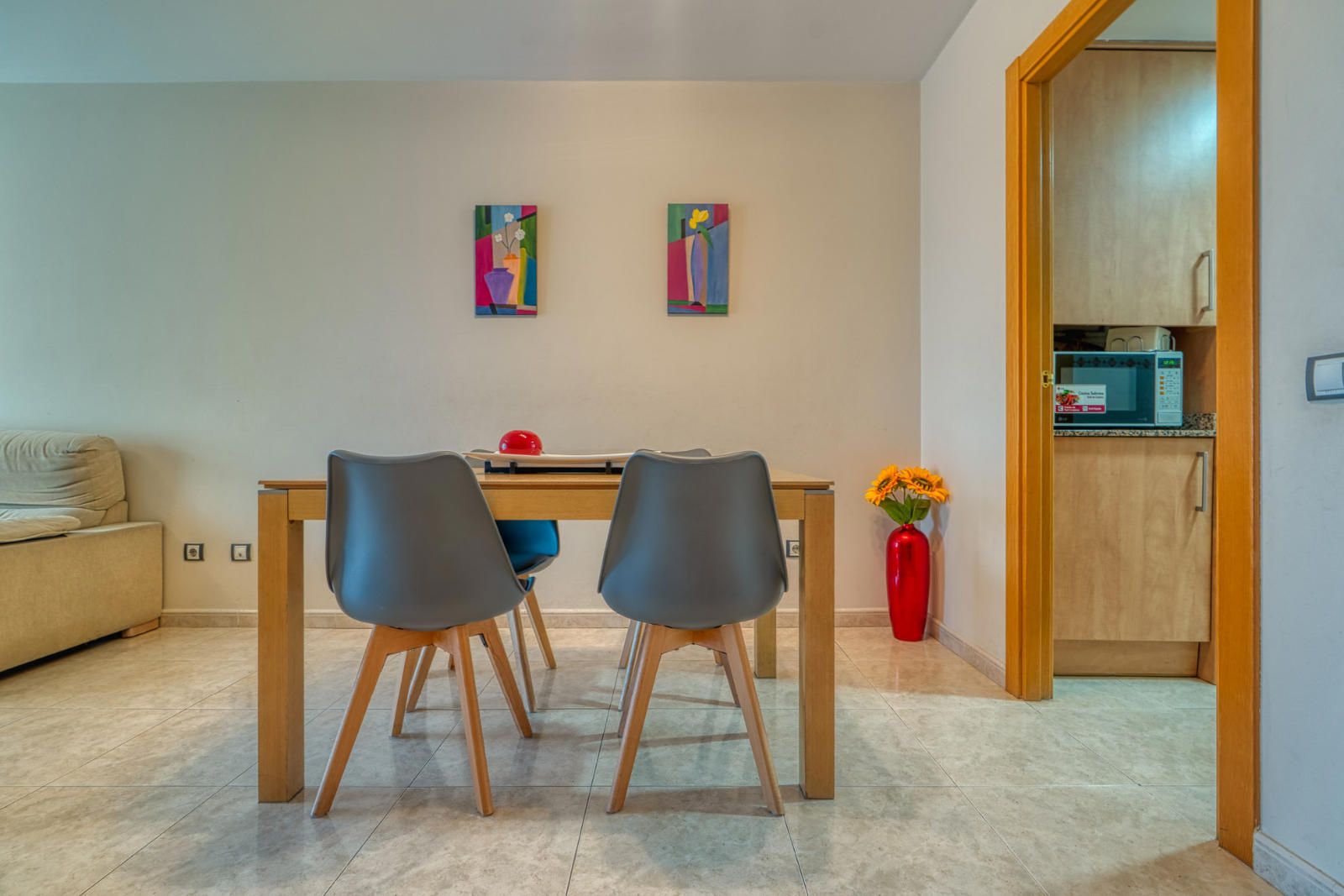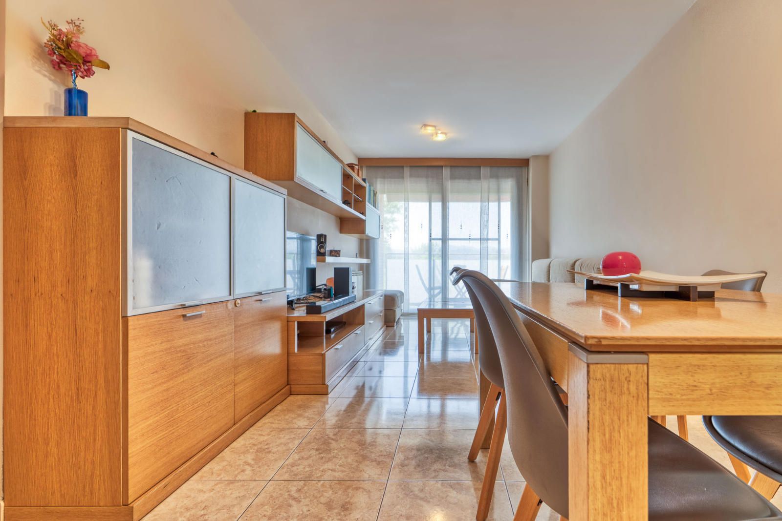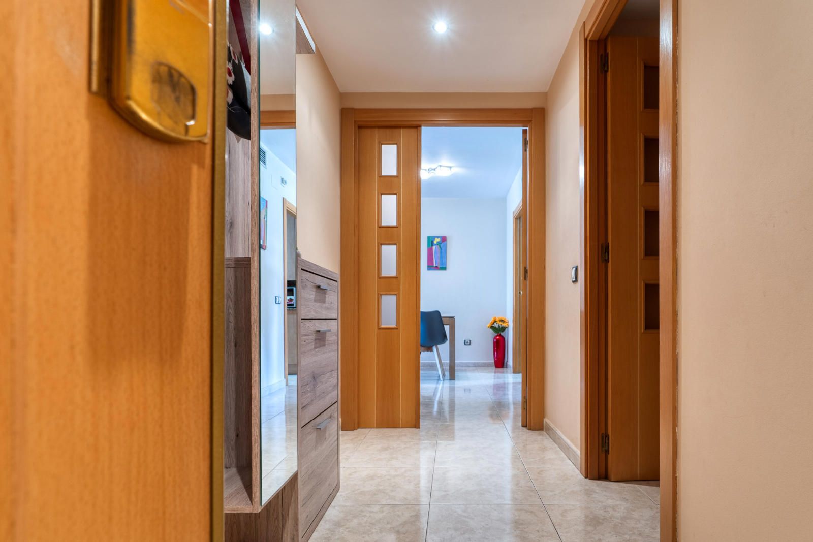 El salón, de planta rectangular y unos 22 m², se organiza en dos áreas diferenciadas. Junto al ventanal de cuerpo entero con salida a la terraza, se encuentra la zona de estar con espacio para sofás, mueble de televisión y elementos decorativos. En la parte próxima a la entrada, pared con pared con la cocina, se ubica la zona de comedor, con capacidad para una mesa de 4 comensales ampliable hasta 8 o 12 según necesidad.