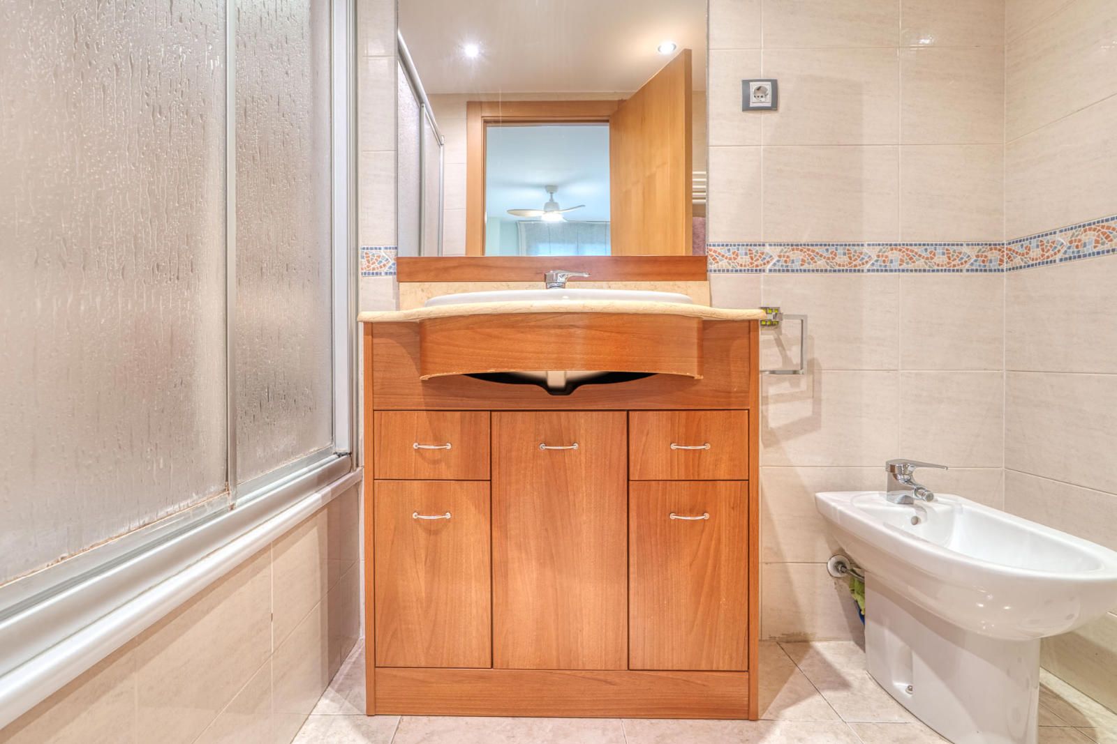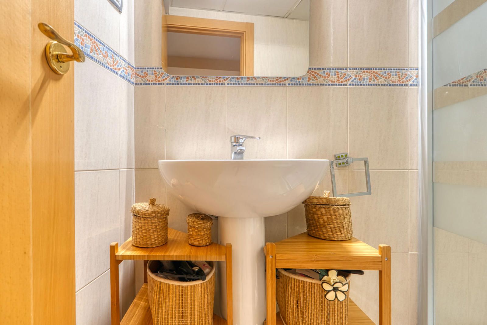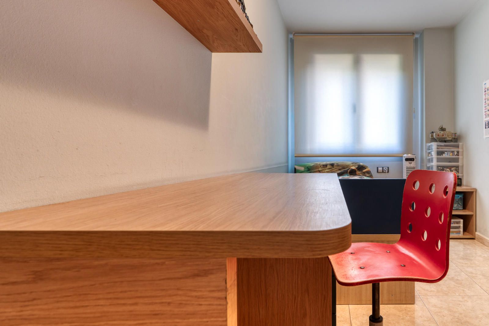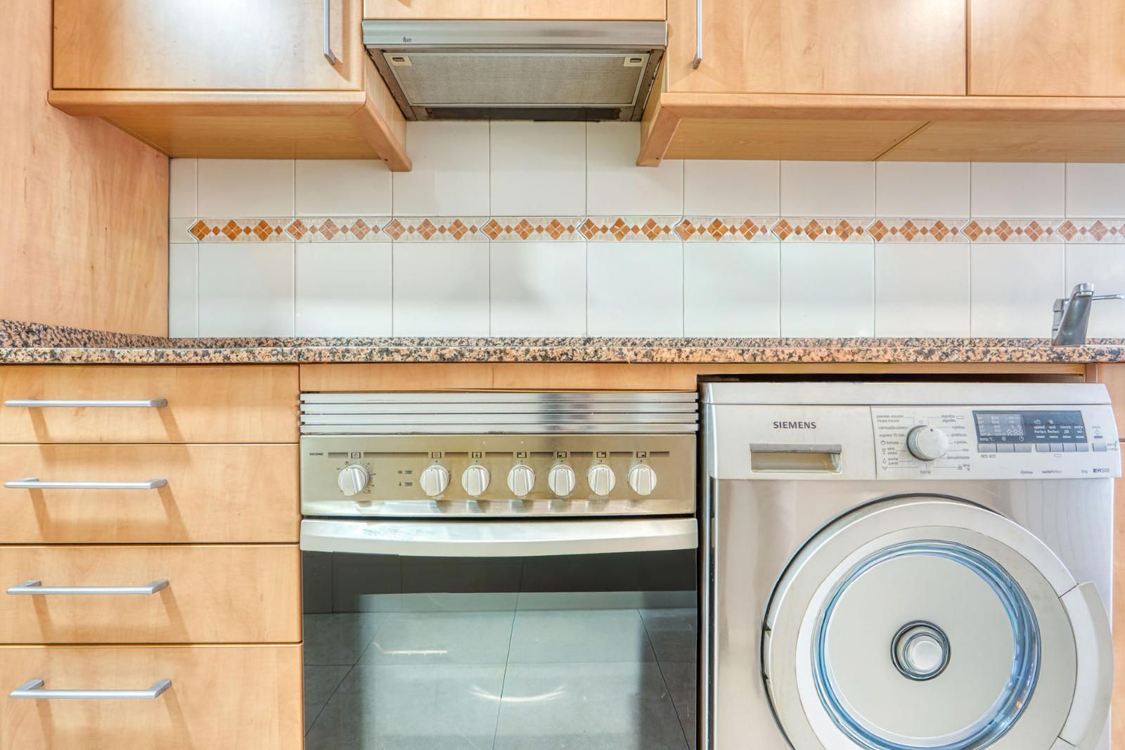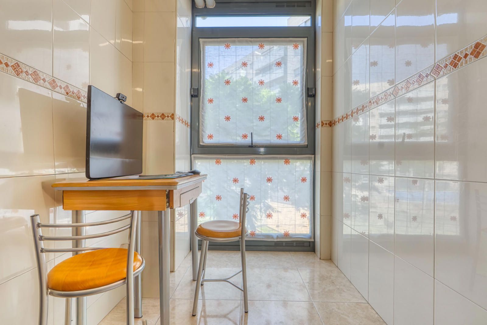 La cocina, de forma rectangular alargada, dispone de mobiliario en una sola pared, azulejos en blanco y muebles en tono madera. Destaca el área del fondo, junto a un amplio ventanal, con espacio suficiente para ubicar una mesa office destinada a desayunos y comidas diarias de manera cómoda y práctica.