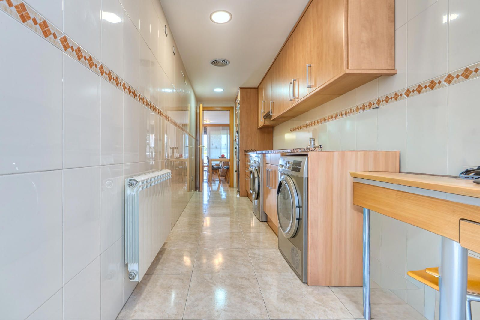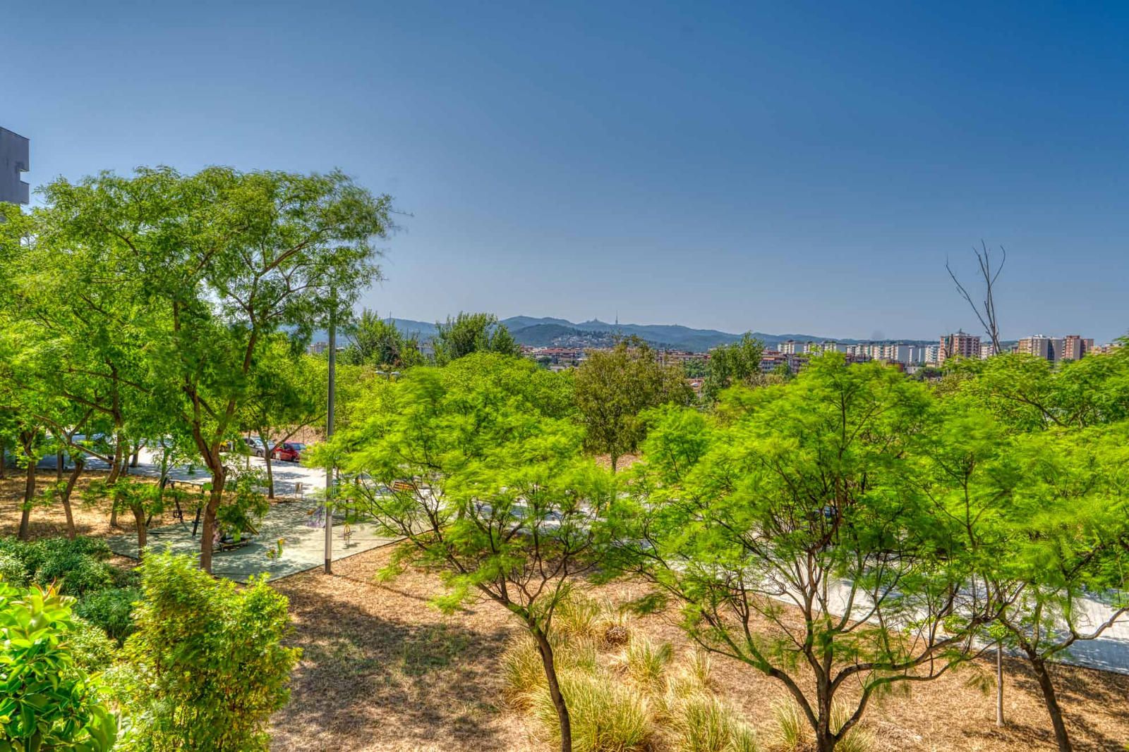 La terraza, orientada al Sureste, recibe sol y luz durante todo el día. Desde ella se aprecian las zonas comunitarias con piscina infantil, piscina de adultos, césped y parque infantil, además de vistas despejadas hacia Collserola, Cerdanyola y el Tibidabo. Su tamaño y orientación la convierten en un espacio idóneo tanto para comidas y cenas familiares como para actividades de teletrabajo o descanso.