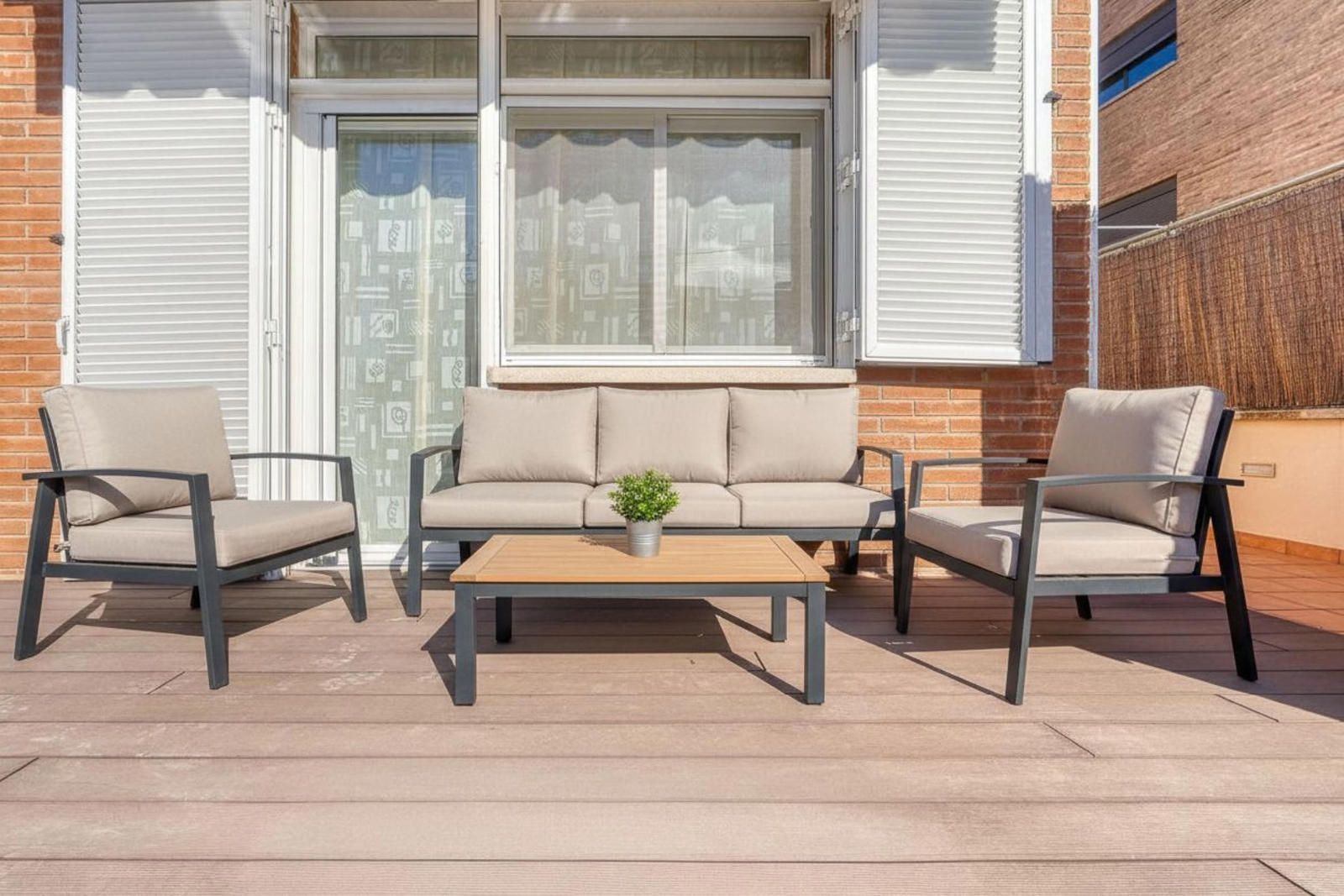 El exterior rodea la vivienda con distintos espacios de terraza y jardín, articulando zonas de comedor exterior, barbacoa y áreas de estar vinculadas a la piscina, manteniendo privacidad y continuidad con las estancias principales.