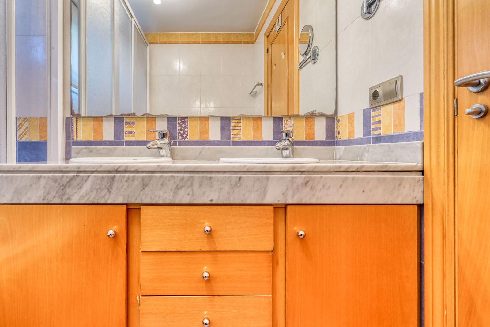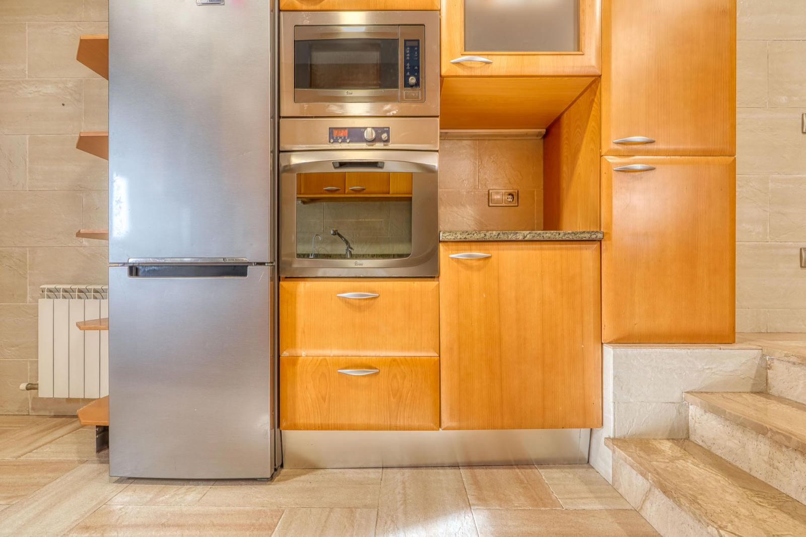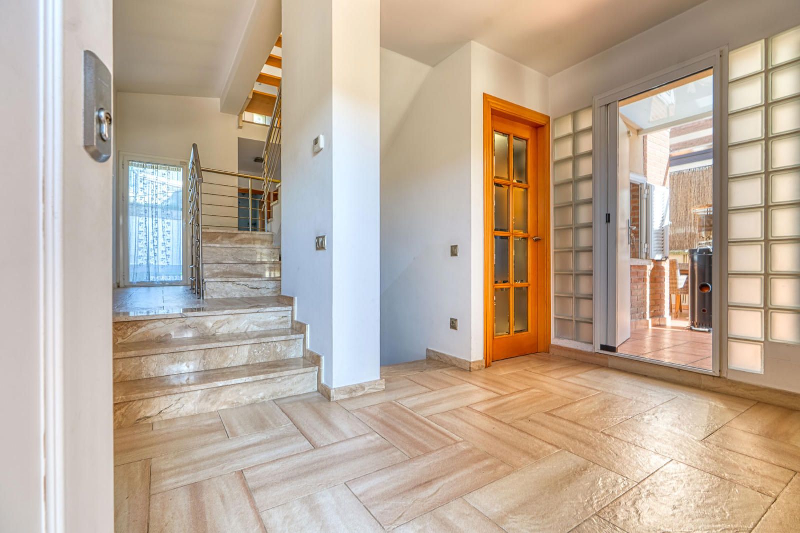 La planta principal (107 m²) reúne un salón–comedor de 36 m² con ventanales a tres fachadas y un desnivel resuelto con dos escalones, con salida directa al área de piscina y solárium. La entrada se organiza alrededor de una escalera central de mármol, con barandillas de trazo ligero y un distribuidor que concentra la circulación. La cocina, de 30 m², se estructura en dos ámbitos de trabajo, con barra para desayunos y zona de lavado en un nivel diferenciado. En esta planta se sitúa además una habitación con armario empotrado.