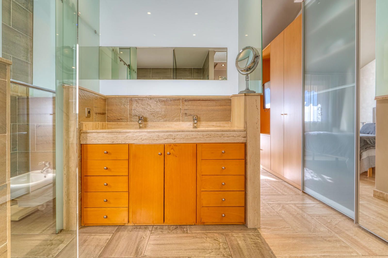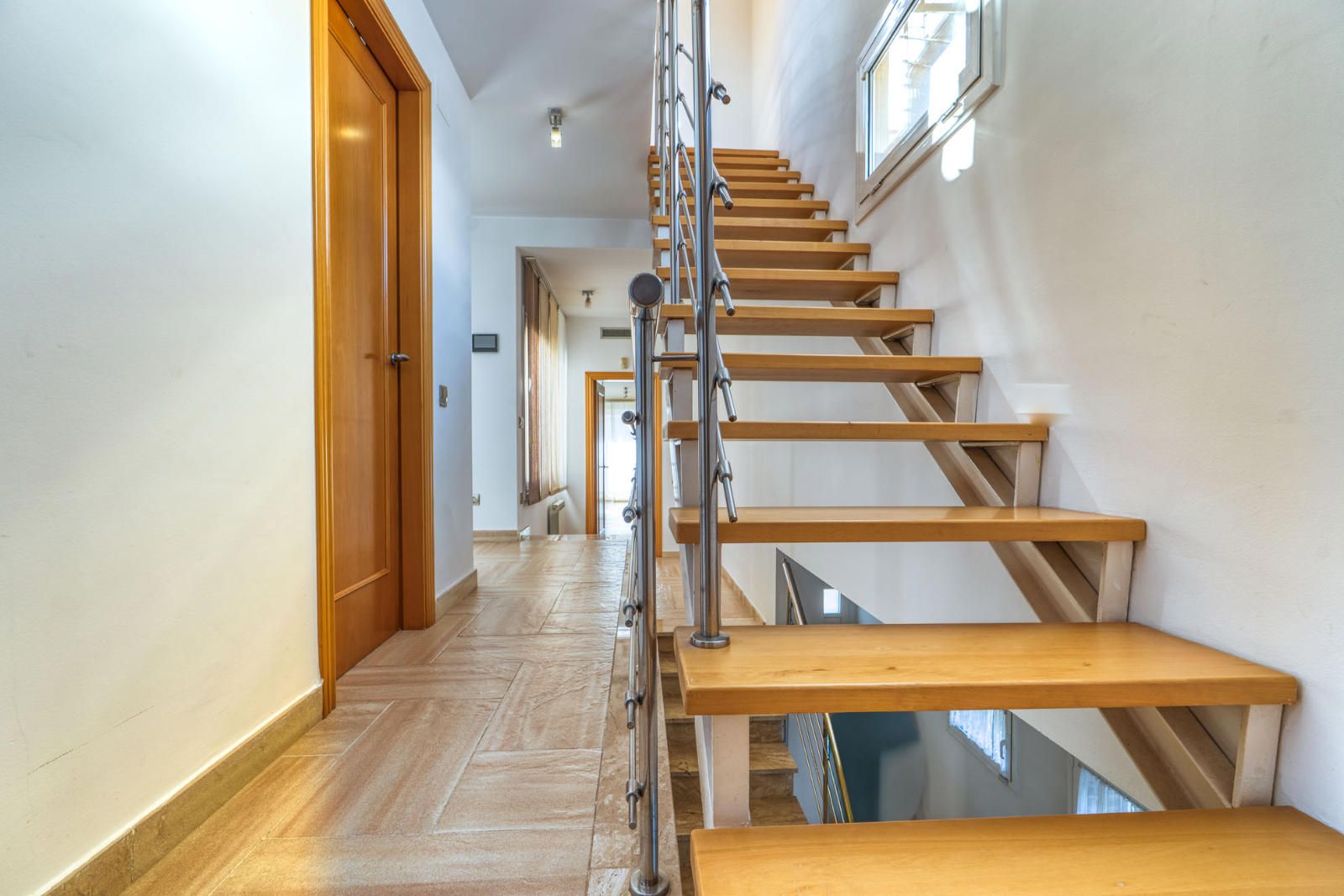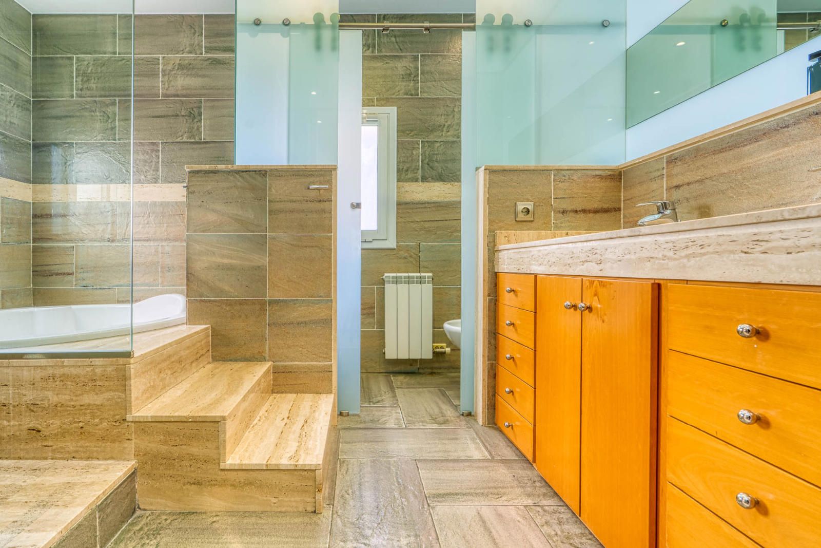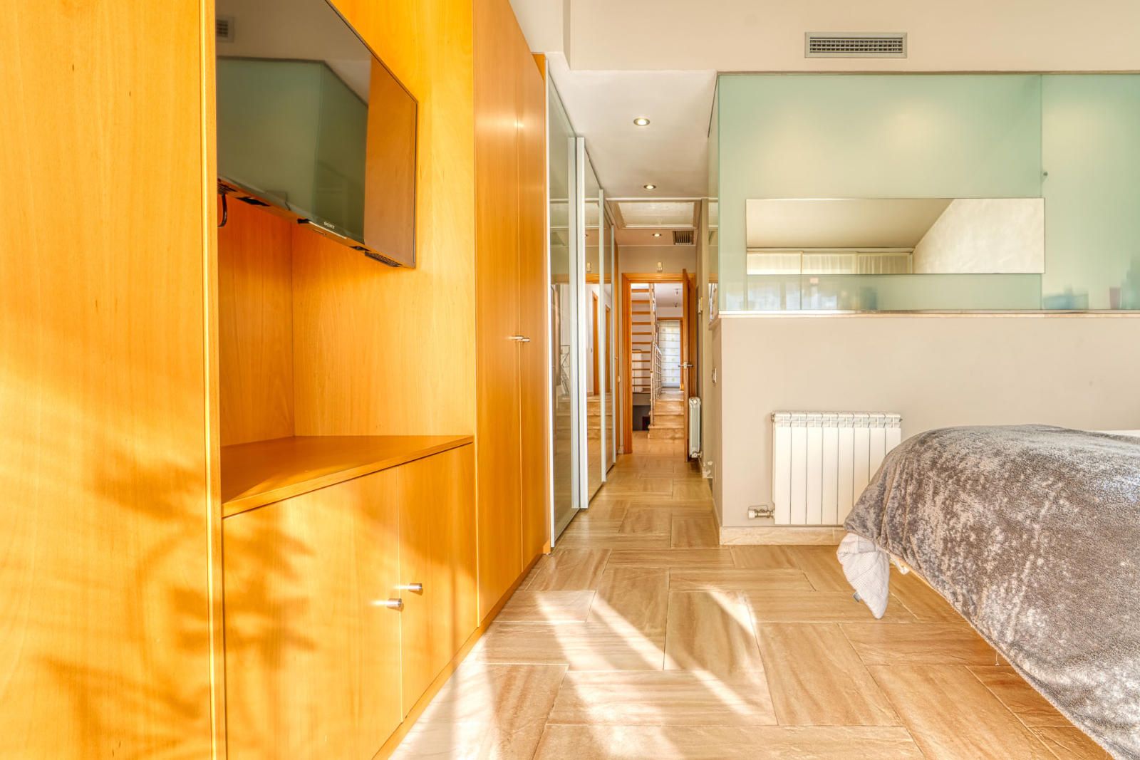 La primera planta (93 m²) incorpora tres habitaciones. La suite principal se abre a una terraza con vistas a Collserola, dispone de un frente lineal de armarios empotrados de 9 metros y un baño con ducha, bañera de hidromasaje y lavabo de doble seno, con sanitarios resueltos tras un murete sin puerta. El pasillo se apoya en ventanales a ambos lados, aportando luz natural al recorrido, y conecta con otras dos habitaciones dobles y un segundo baño completo de cuatro piezas con bañera.