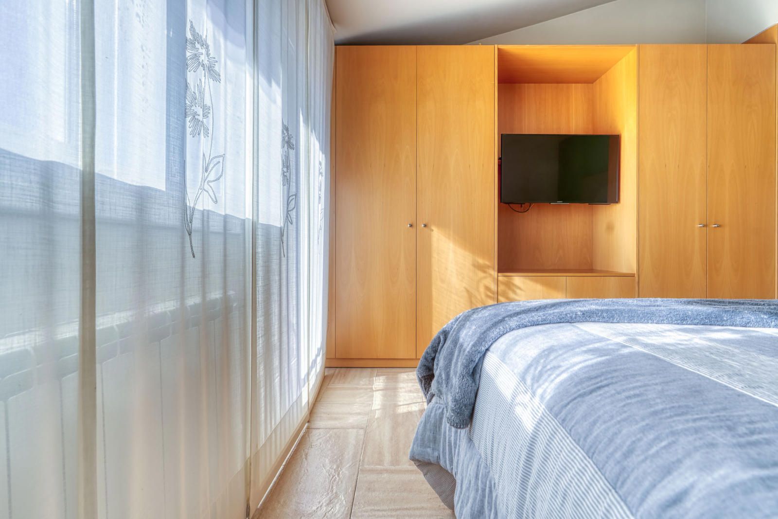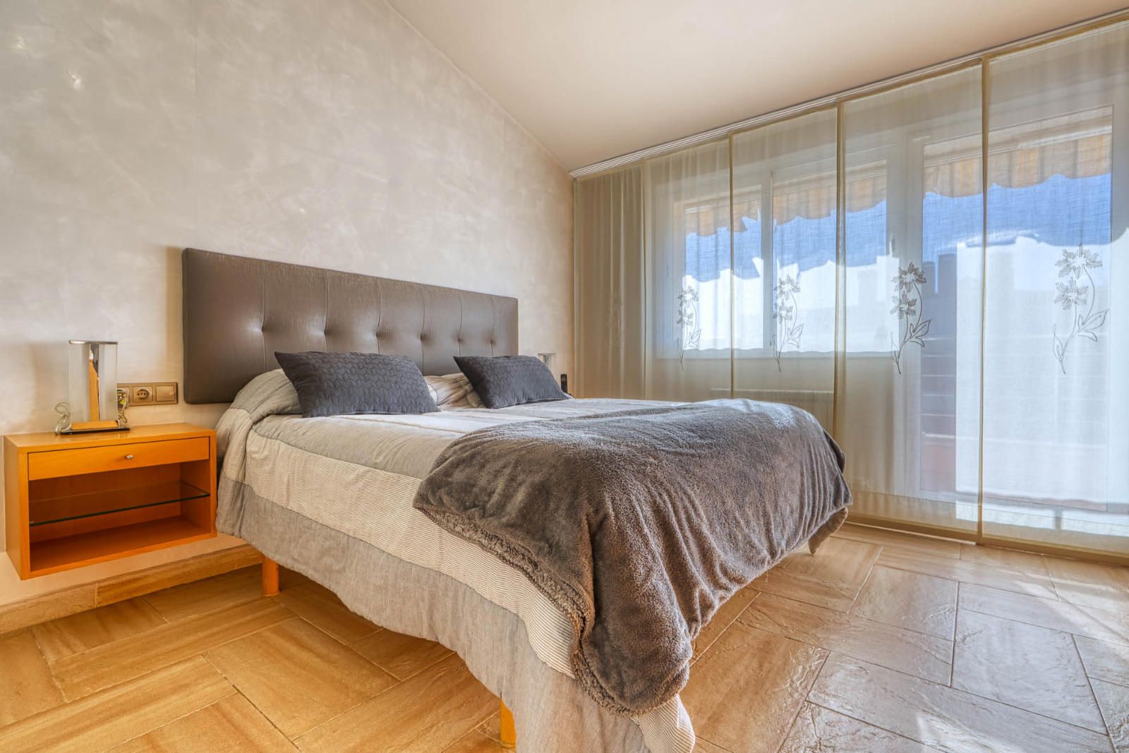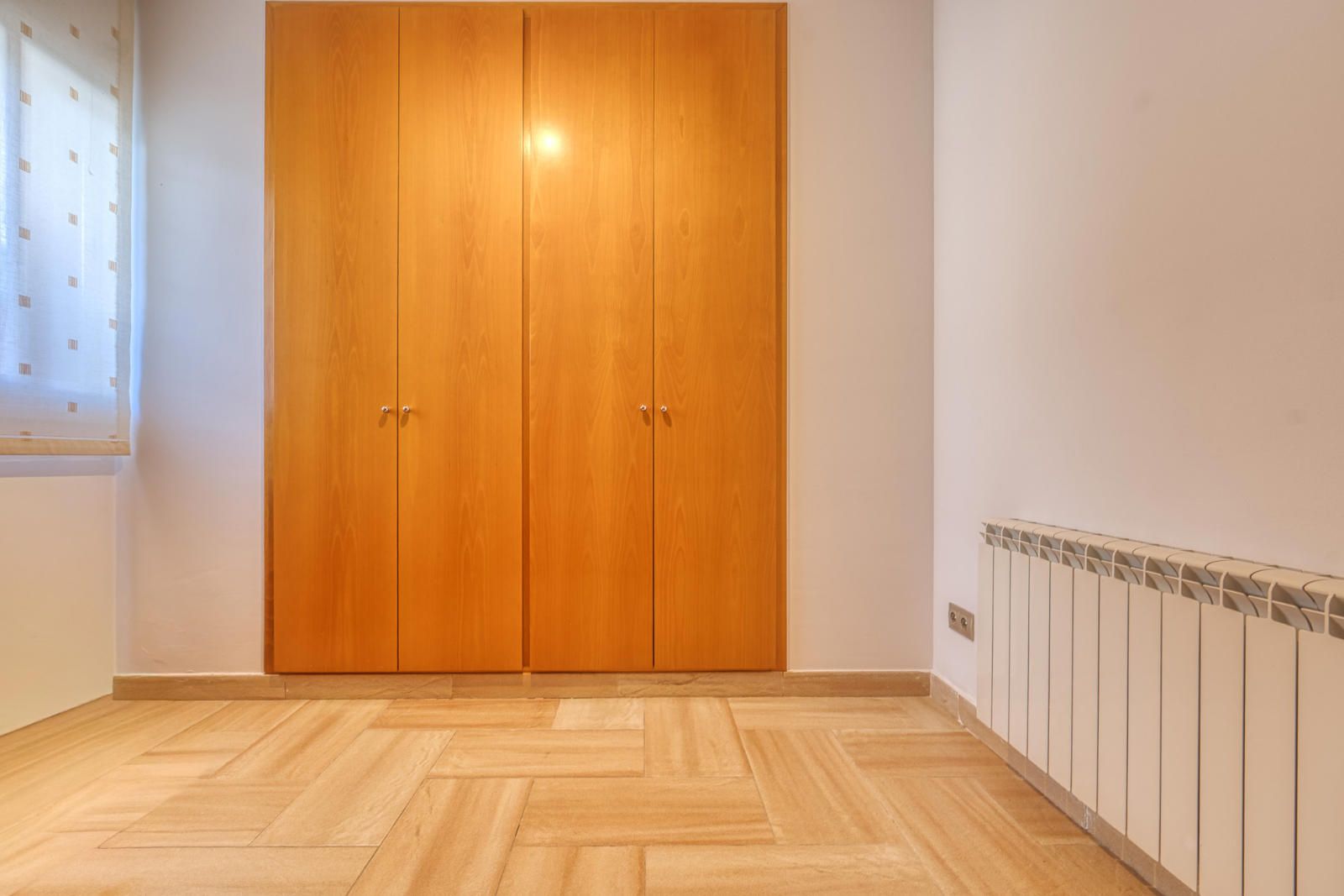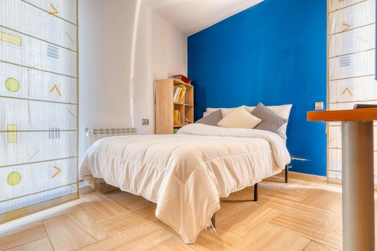 La primera planta (93 m²) incorpora tres habitaciones. La suite principal se abre a una terraza con vistas a Collserola, dispone de un frente lineal de armarios empotrados de 9 metros y un baño con ducha, bañera de hidromasaje y lavabo de doble seno, con sanitarios resueltos tras un murete sin puerta. El pasillo se apoya en ventanales a ambos lados, aportando luz natural al recorrido, y conecta con otras dos habitaciones dobles y un segundo baño completo de cuatro piezas con bañera.