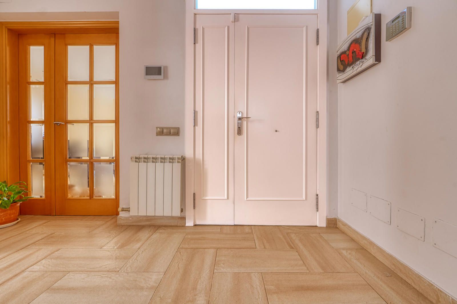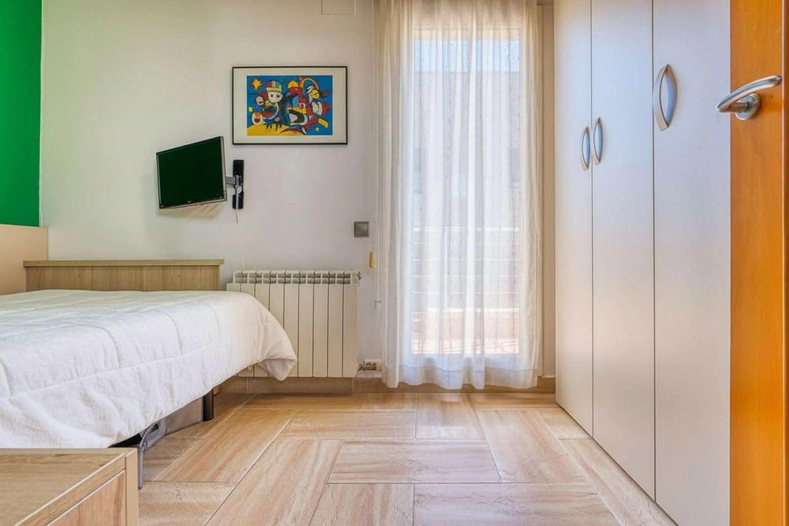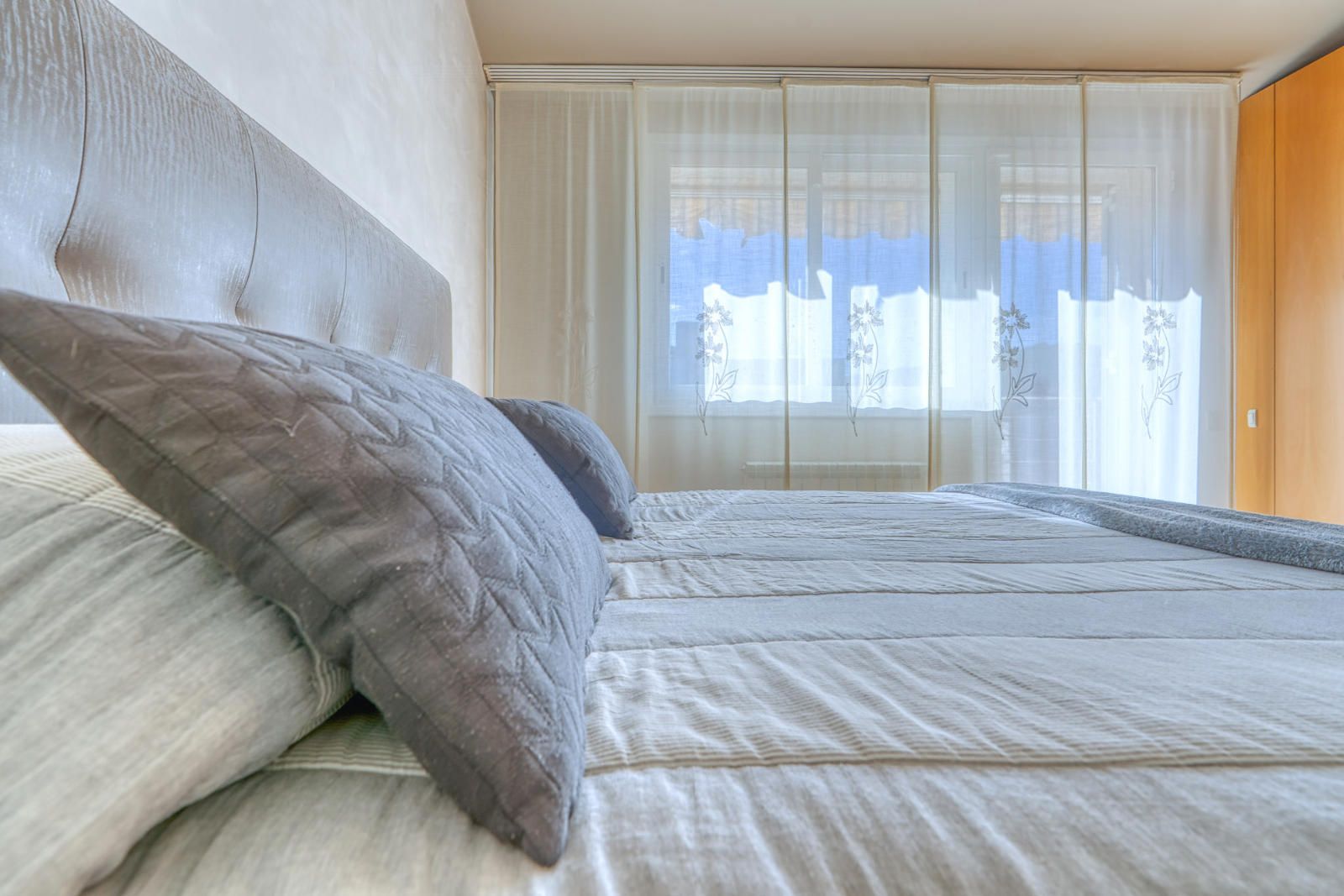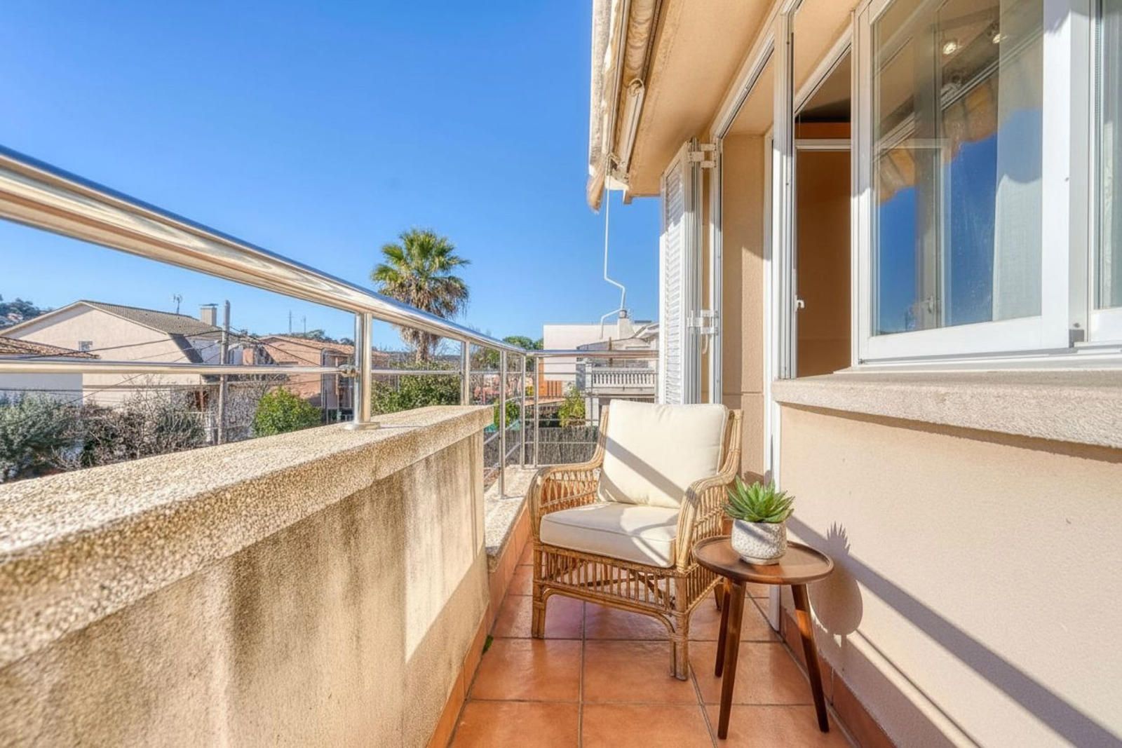 La primera planta (93 m²) incorpora tres habitaciones. La suite principal se abre a una terraza con vistas a Collserola, dispone de un frente lineal de armarios empotrados de 9 metros y un baño con ducha, bañera de hidromasaje y lavabo de doble seno, con sanitarios resueltos tras un murete sin puerta. El pasillo se apoya en ventanales a ambos lados, aportando luz natural al recorrido, y conecta con otras dos habitaciones dobles y un segundo baño completo de cuatro piezas con bañera.
