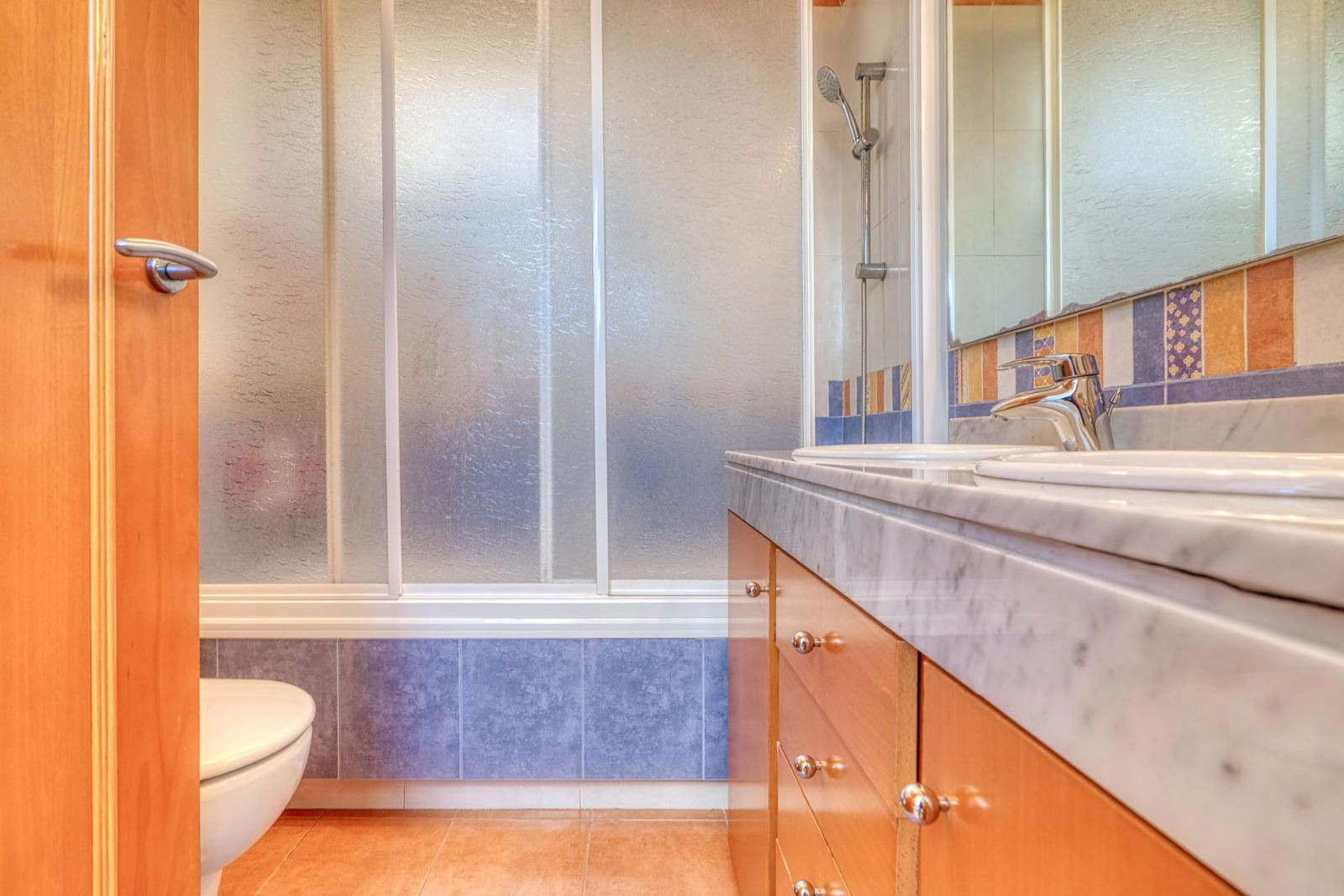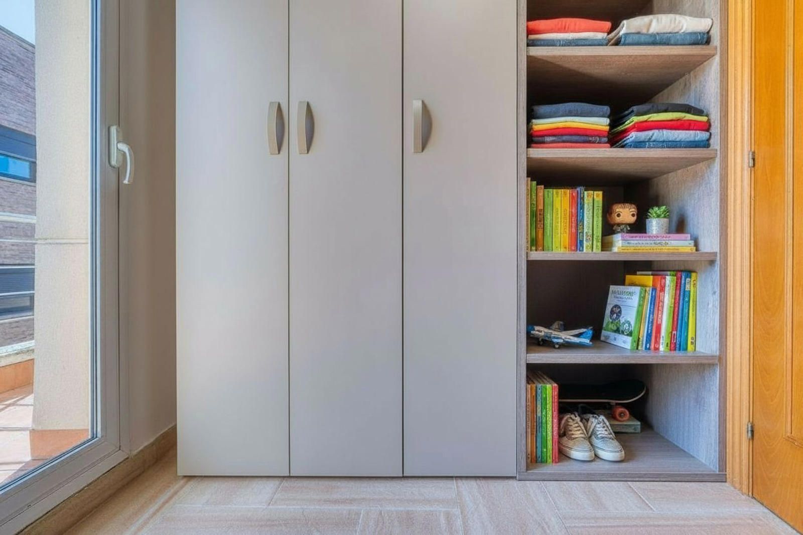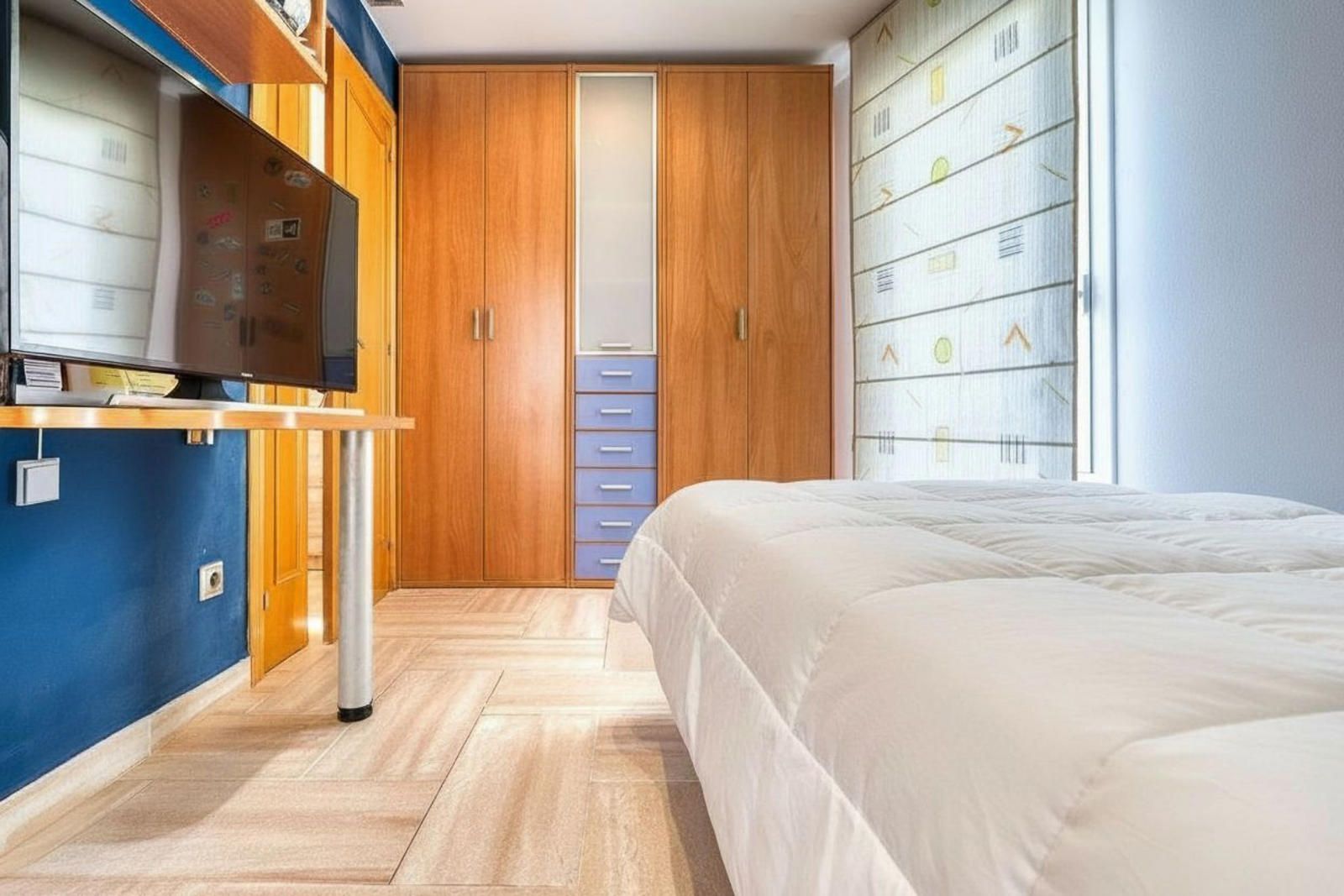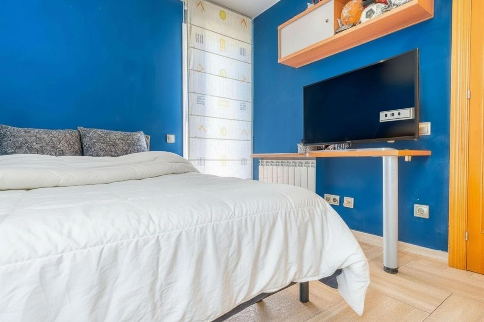 La primera planta (93 m²) incorpora tres habitaciones. La suite principal se abre a una terraza con vistas a Collserola, dispone de un frente lineal de armarios empotrados de 9 metros y un baño con ducha, bañera de hidromasaje y lavabo de doble seno, con sanitarios resueltos tras un murete sin puerta. El pasillo se apoya en ventanales a ambos lados, aportando luz natural al recorrido, y conecta con otras dos habitaciones dobles y un segundo baño completo de cuatro piezas con bañera.