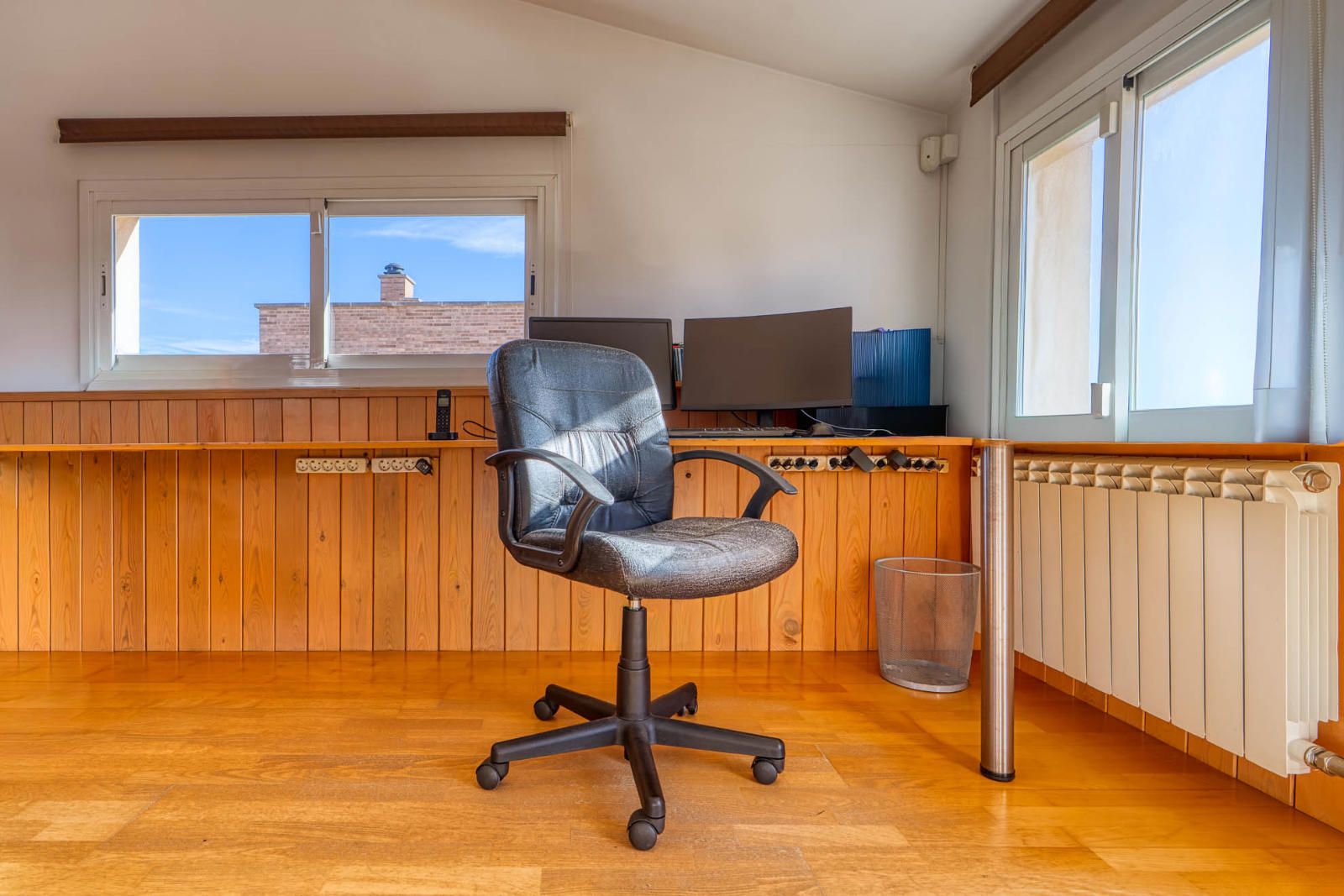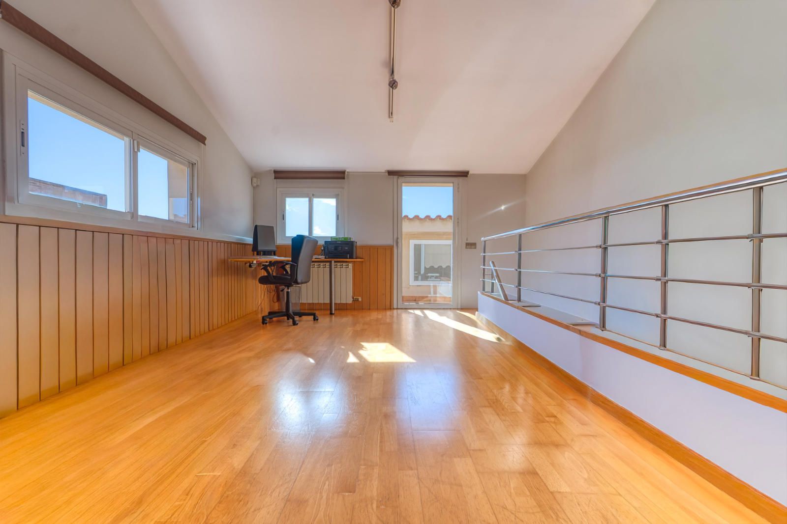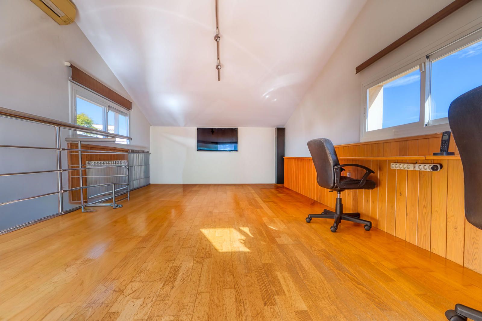 La buhardilla, de 26 m², se plantea como una estancia diáfana con techo alto y ventanales continuos en tres fachadas, lo que amplía su uso como sala complementaria.